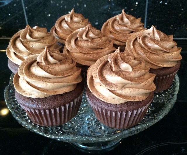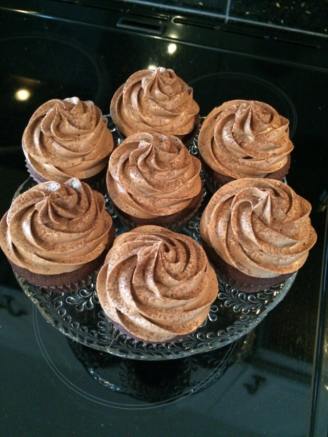 Videre laget jeg cupcakes til min manns smak: mørk sjokoladebunn toppet med sjokolade- og kaffekrem. Jeg laget Annas favorittsjokoladekake som base, men tilsatte en shot espresso i deigen. Kremen er en fyldig sjokoladesmørkrem med espresso, her er oppskrift: