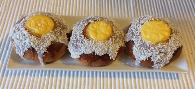 Skolebollene ble fylt med vaniljekrem, og etter steking toppet med melisglasur og kokos.