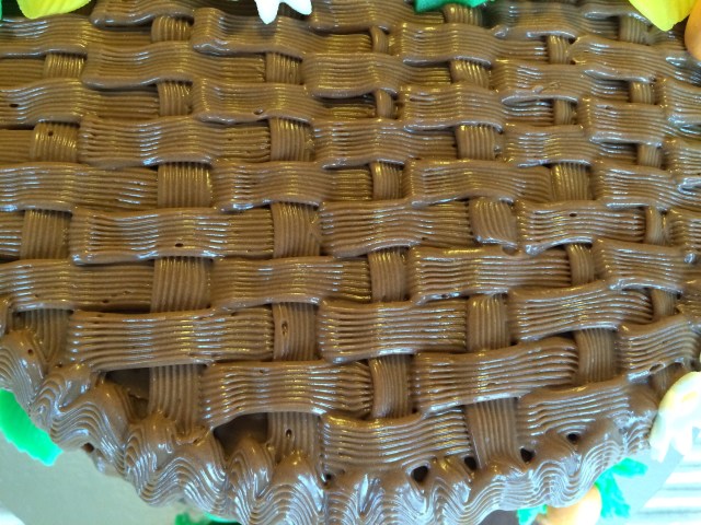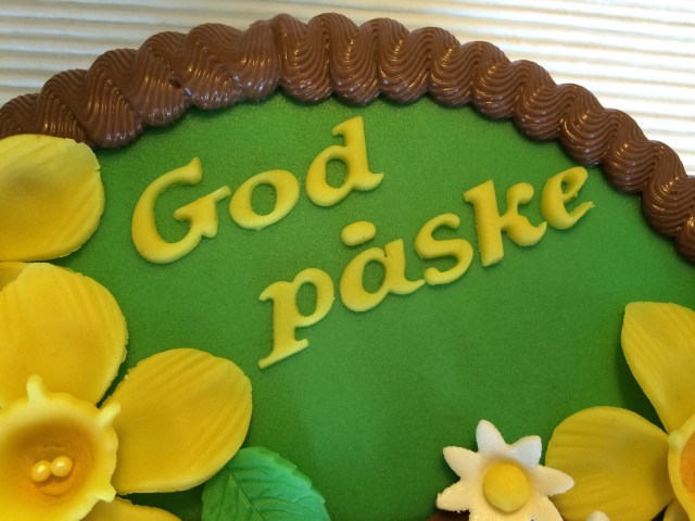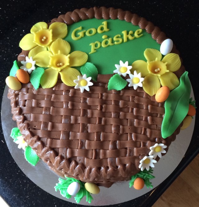 Denne gangen var det passende å lage et påsketema på dekoren. Det er så kjekt med årstider og høytider når man har en hobby som min. Det er alltid nye og spennede prosjekter å begi seg ut på, og man har muligheten til å lage ting man ikke vanligvis ville gjort. Jeg hadde sett et sprøytet kurvmønster jeg hadde lyst til å prøve meg på, så la opp kaken deretter. Teknikken var overraskende enkel, men blir nok enda finere finish neste gang, når jeg har prøvd det før 🙂 Så halvdelen av kaken ble altså dekket av kurvmønster i sjokoladekrem, andre halvparten ble trukket i marsipan. Laget noen enkle «man tager hva man haver»-påskeliljer av en fembladsutstikker til roser som jeg dro litt ut på midten av hvert blad og laget litt mønster på, og kjernen laget jeg av en del av et lilje-utstikkersett. Dustet litt oransje i midten og puttet inni et par sukkerperler. Ellers pyntet jeg med noen småblomster og blader, samt Anton Berg mandelegg. Litt «gress» nede på brettet, og teksten «God påske» ble siste finish 🙂