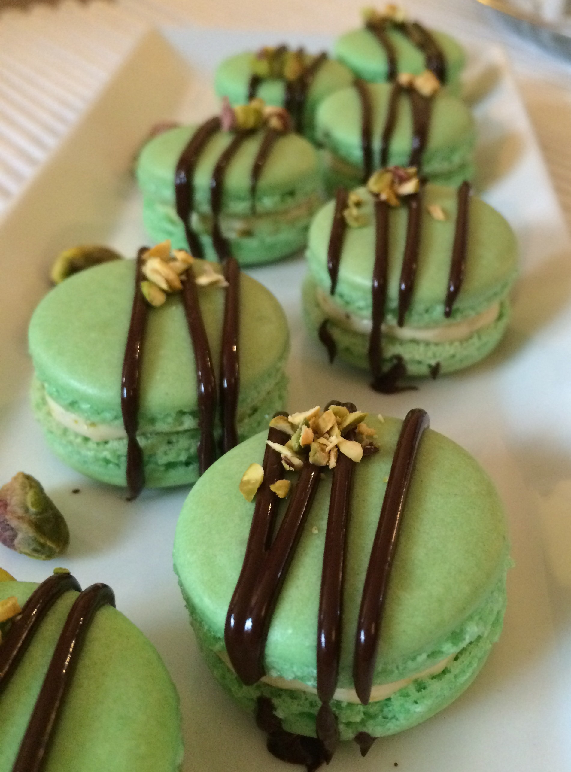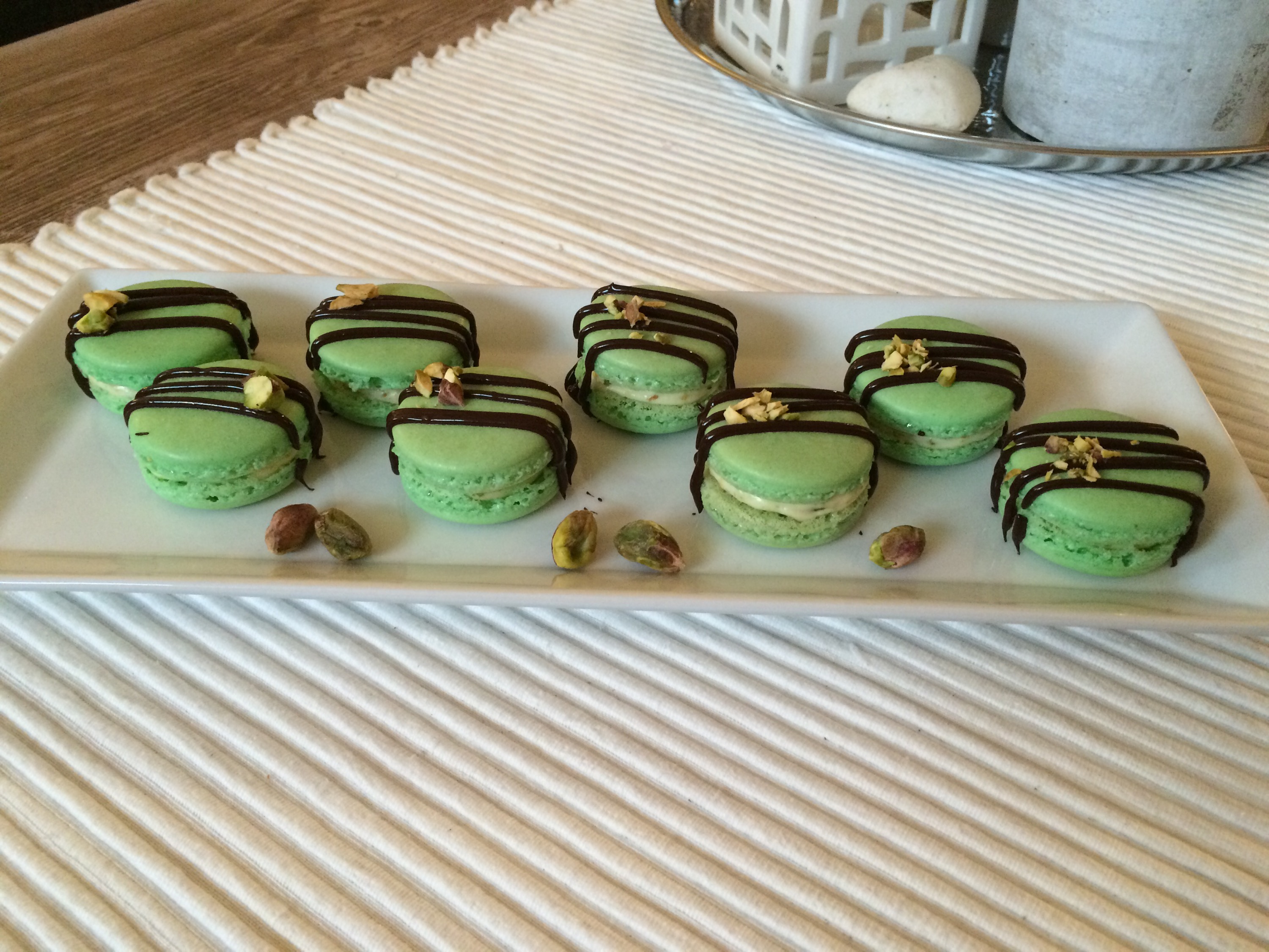 Jeg toppet makronene med smeltet sjokolade og hakket pistasjenøtter.