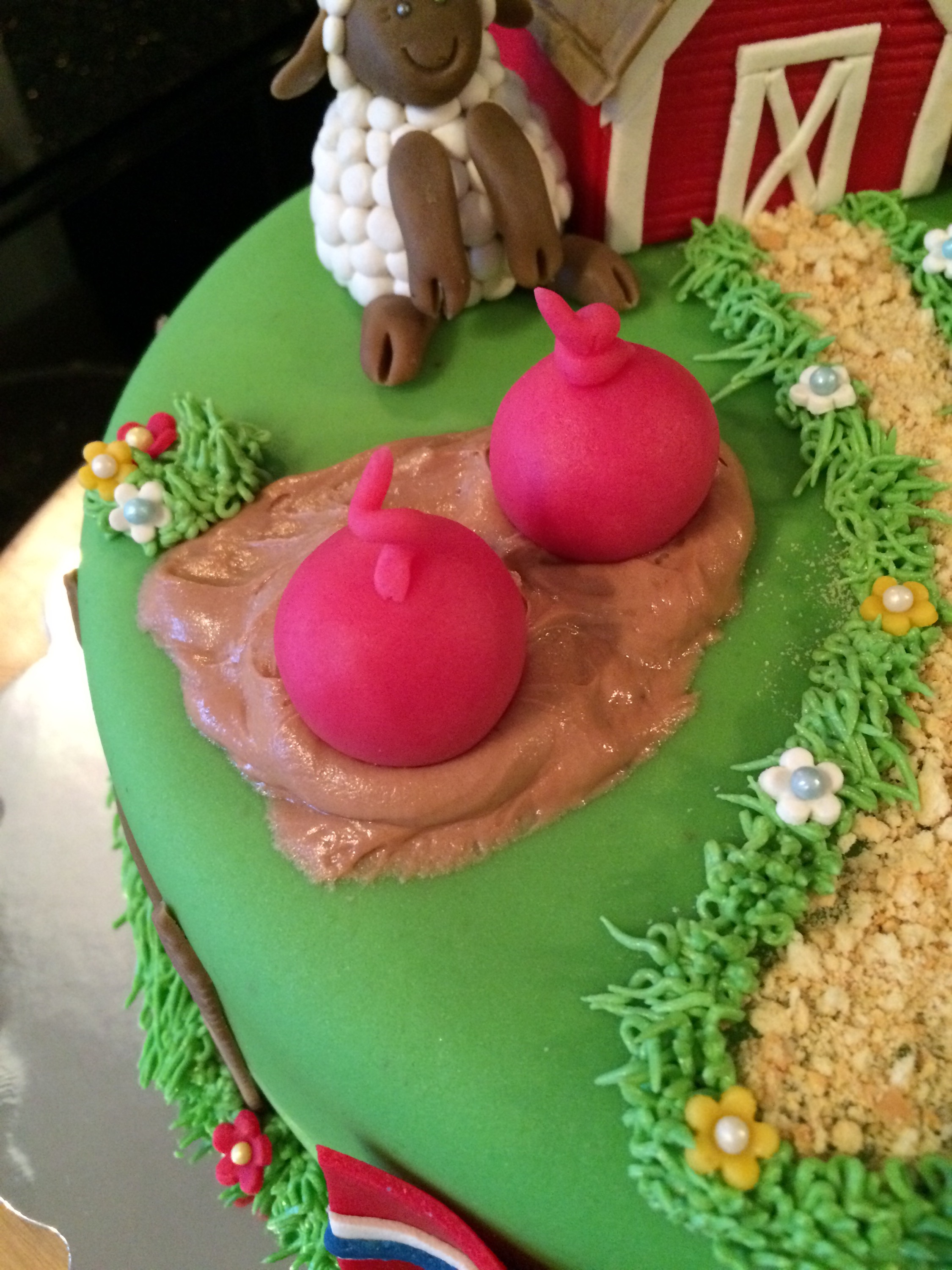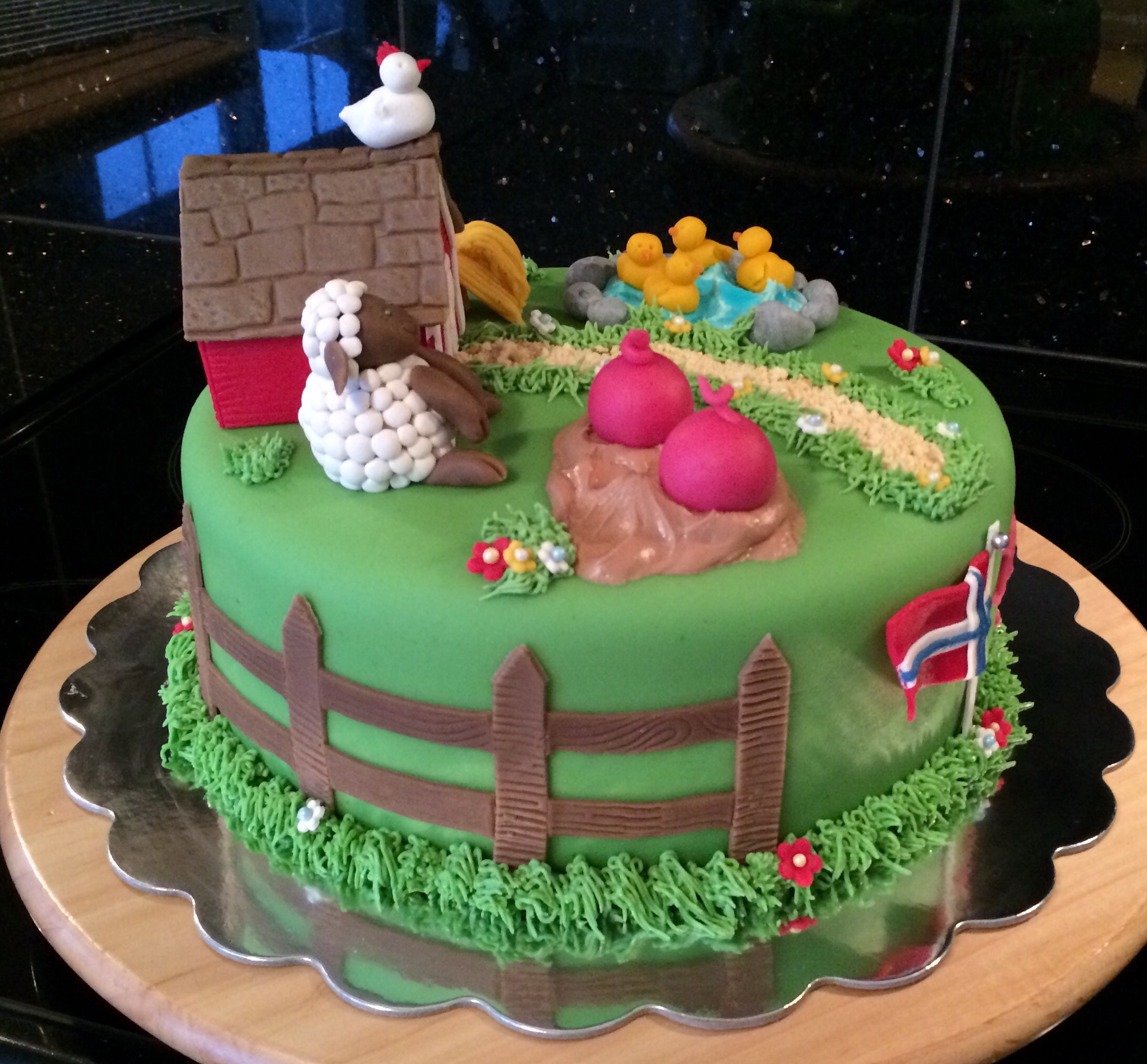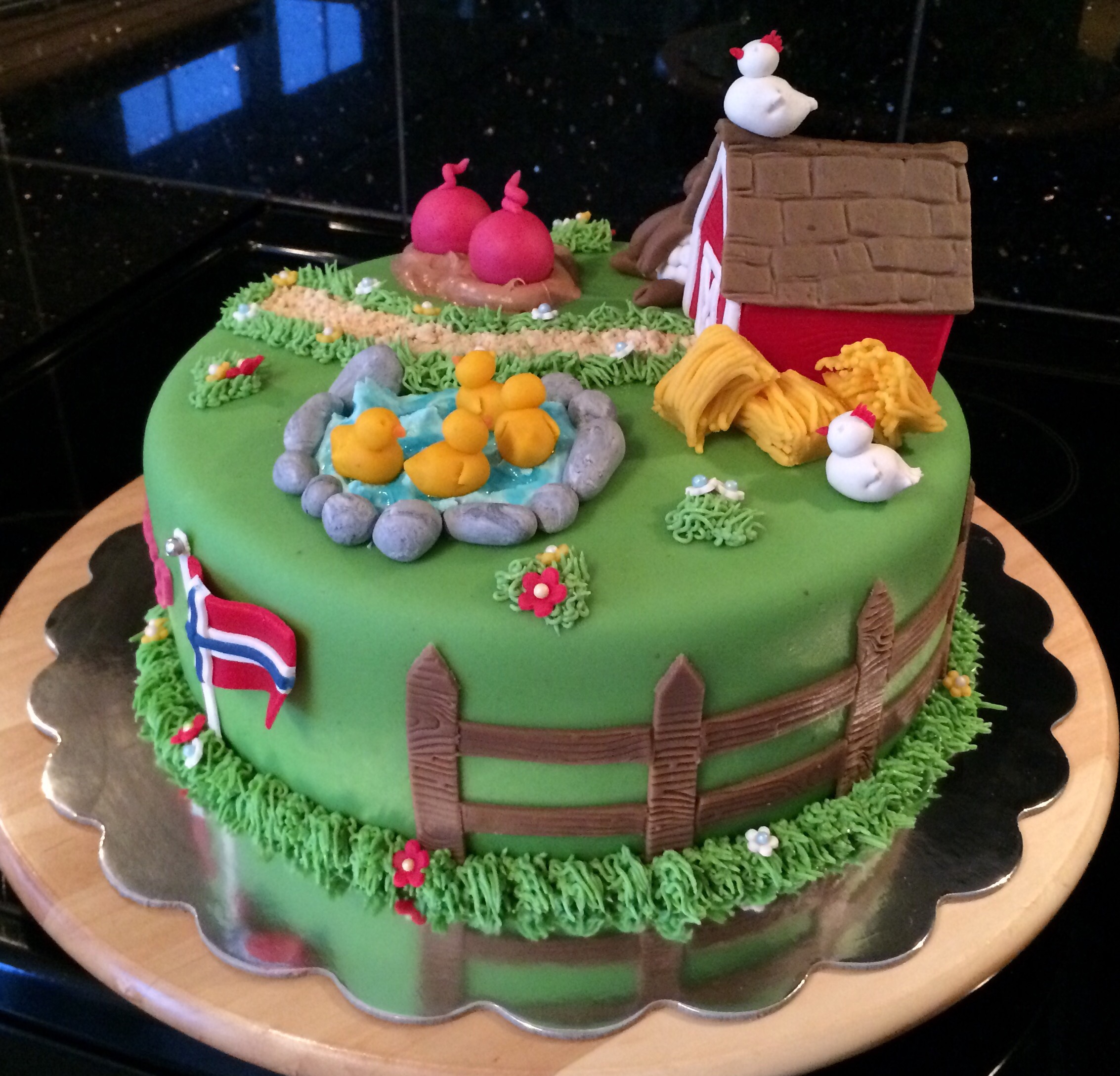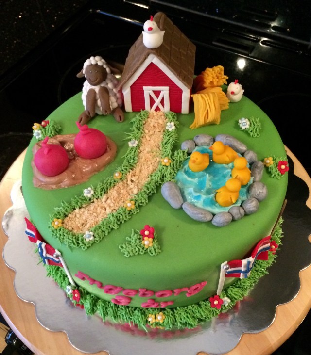 Utformingen av denne kaken var artig, jeg gikk all in med tanke på pynt, og laget masse elementer som passet temaet: en rød låve, andedam, grisebinge, flagg, gress, gjerde rundt kaken, og selvsagt diverse dyr. Her kan dere se resultatet: