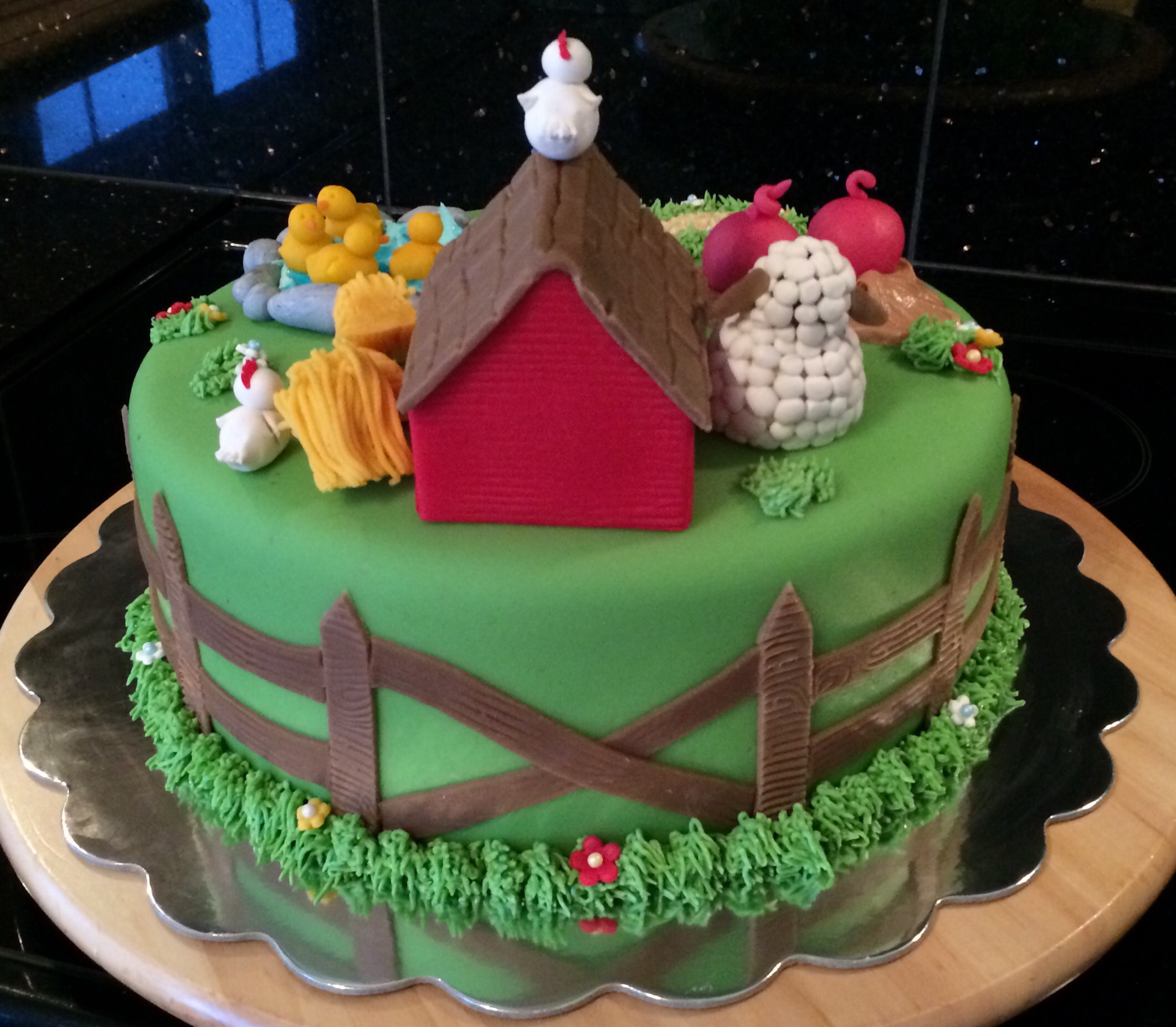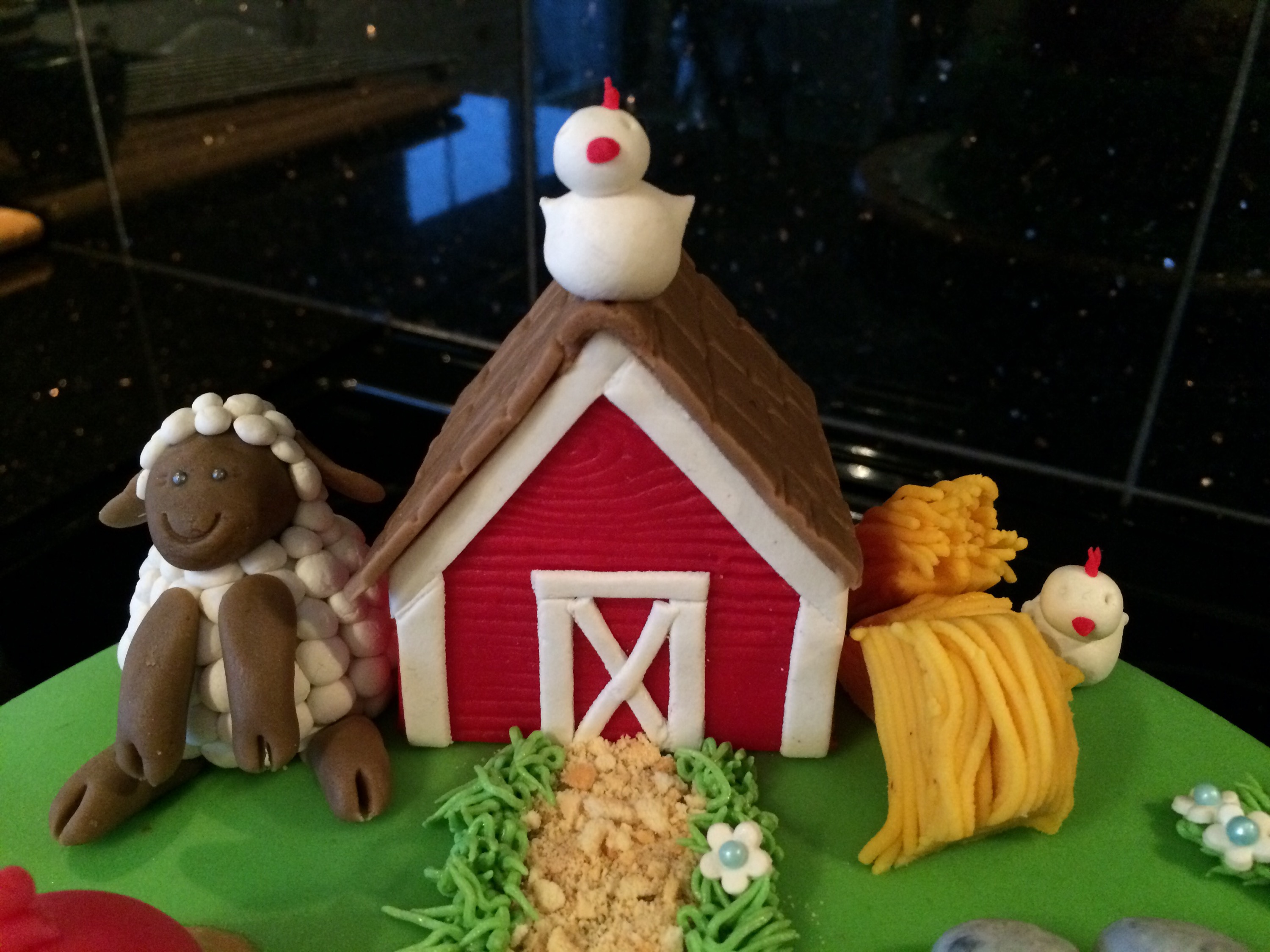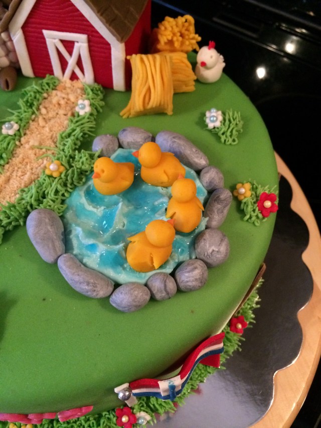 Utformingen av denne kaken var artig, jeg gikk all in med tanke på pynt, og laget masse elementer som passet temaet: en rød låve, andedam, grisebinge, flagg, gress, gjerde rundt kaken, og selvsagt diverse dyr. Her kan dere se resultatet:
