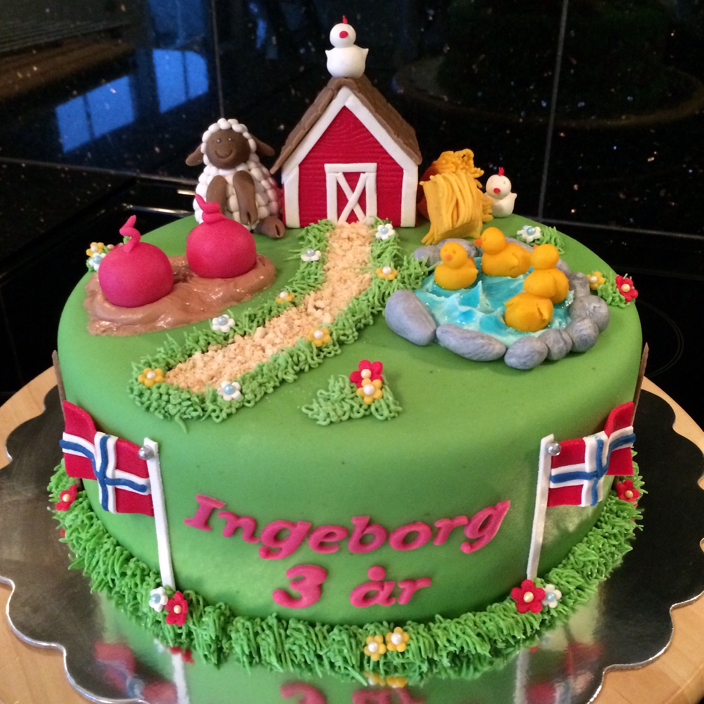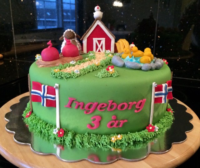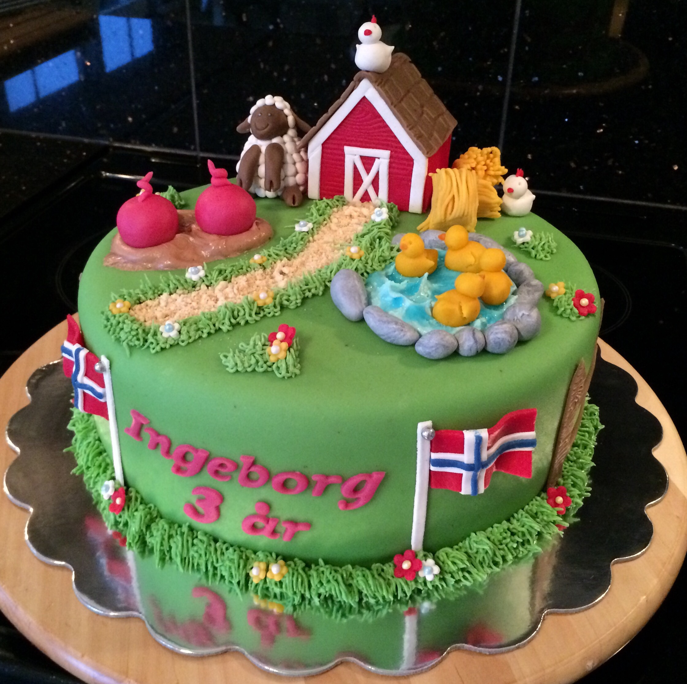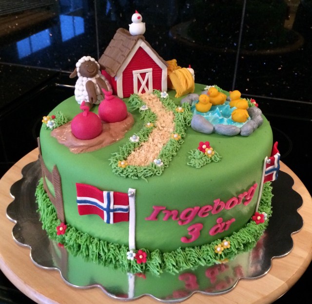 Anyhoo, jeg ble spurt av mammaen til en av småtrollene i barselgruppen jeg gikk i med Nora, om jeg kunne bake til treåringen hennes, og det gjorde jeg gjerne. Hun ville ha et gårdstema, og ha med norske flagg, ellers frie tøyler til utførelsen – jeeei 🙂