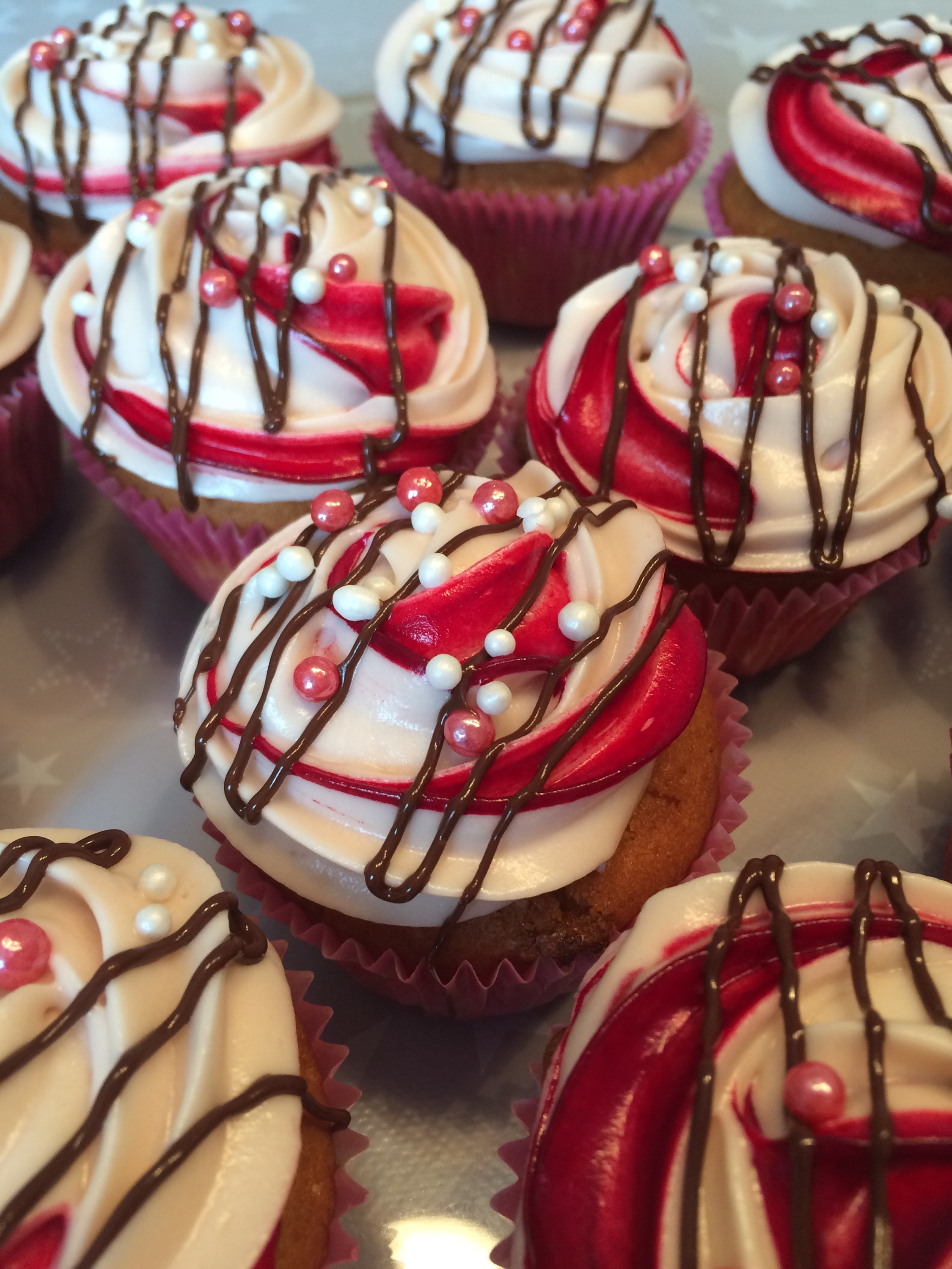 Toppes med smeltet sjokolade, perler eller annen pynt 🙂 Fargeeffekten er laget ved å pensle en stripe geléfarge inni sprøytepose før kremen has i.