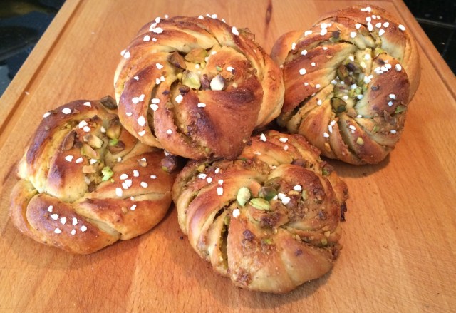 Det var jo som kjent langhelg nylig, og mandagen ble brukt til å fylle frysen med diverse gjærbakst. Det er etterhvert ikke noen hemmelighet at jeg er veldig glad i gjærbakst og gjerne prøver nye varianter. Denne gangen hadde jeg lyst til å prøve meg på en utgave med pistasjenøtter jeg hadde sett på bakemag.no. Oppskriften kan ses her:
