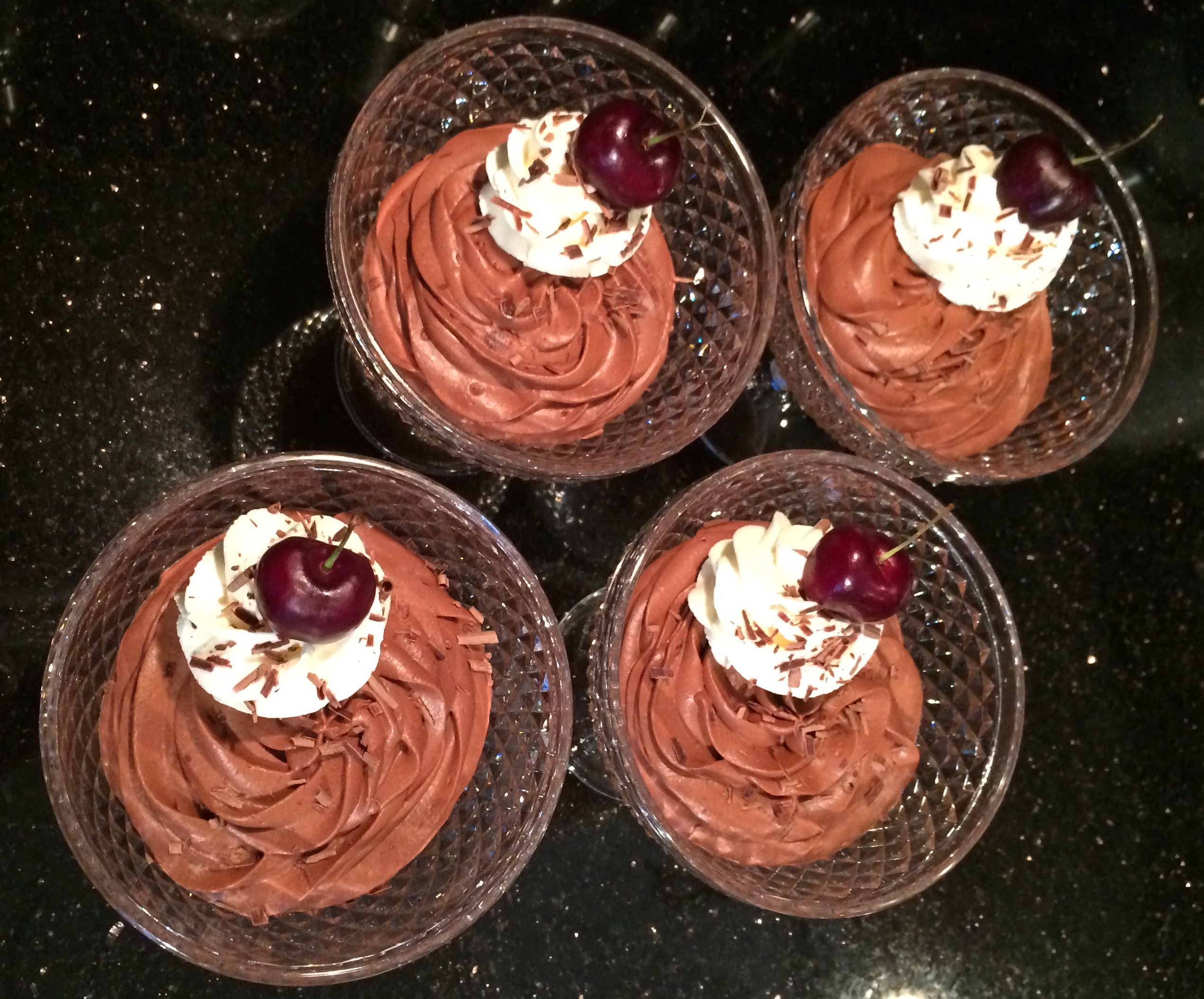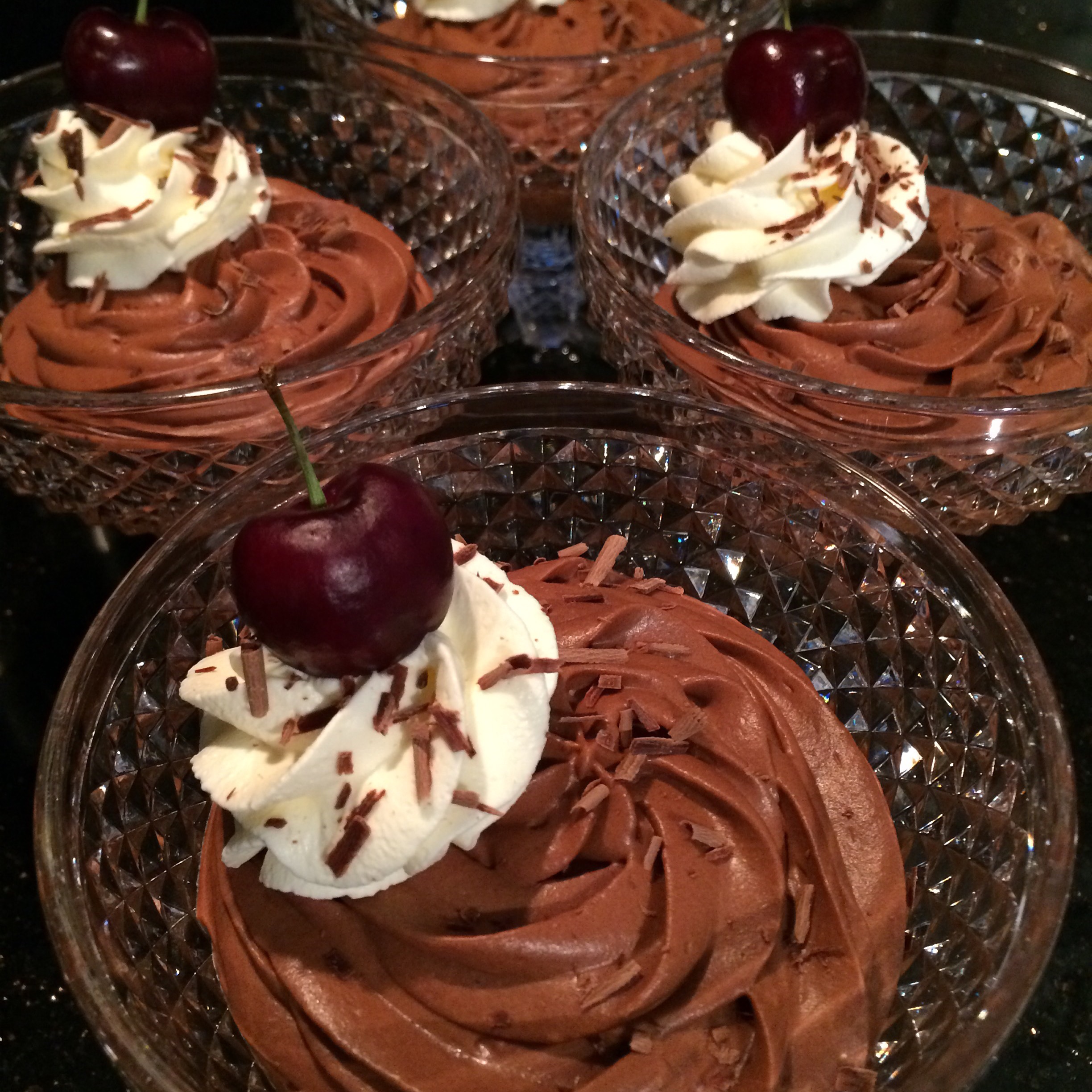 Jeg brukte mørk sjokolade (70%), og toppet den med litt pisket krem, revet sjokolade og et kirsebær til pynt.