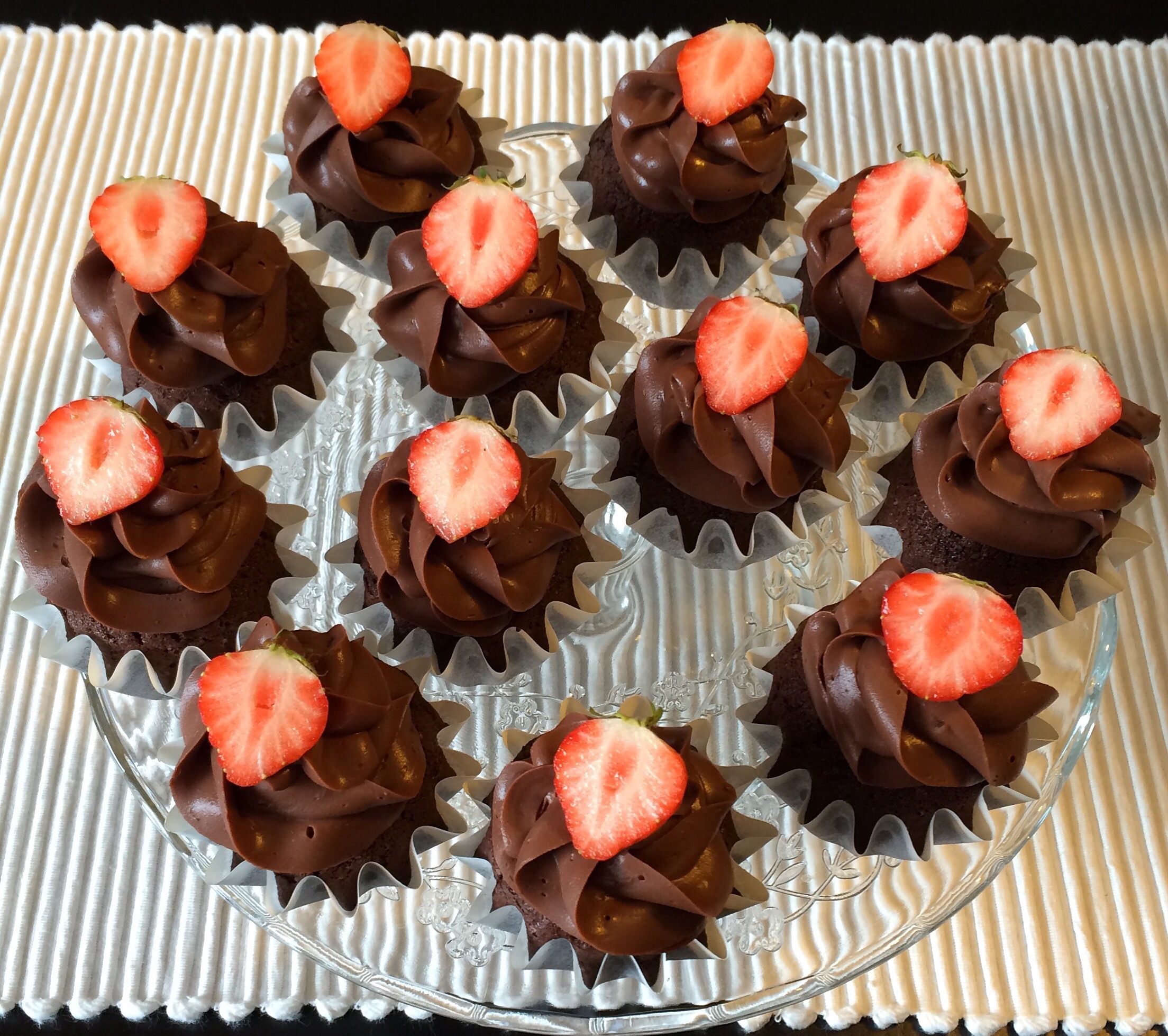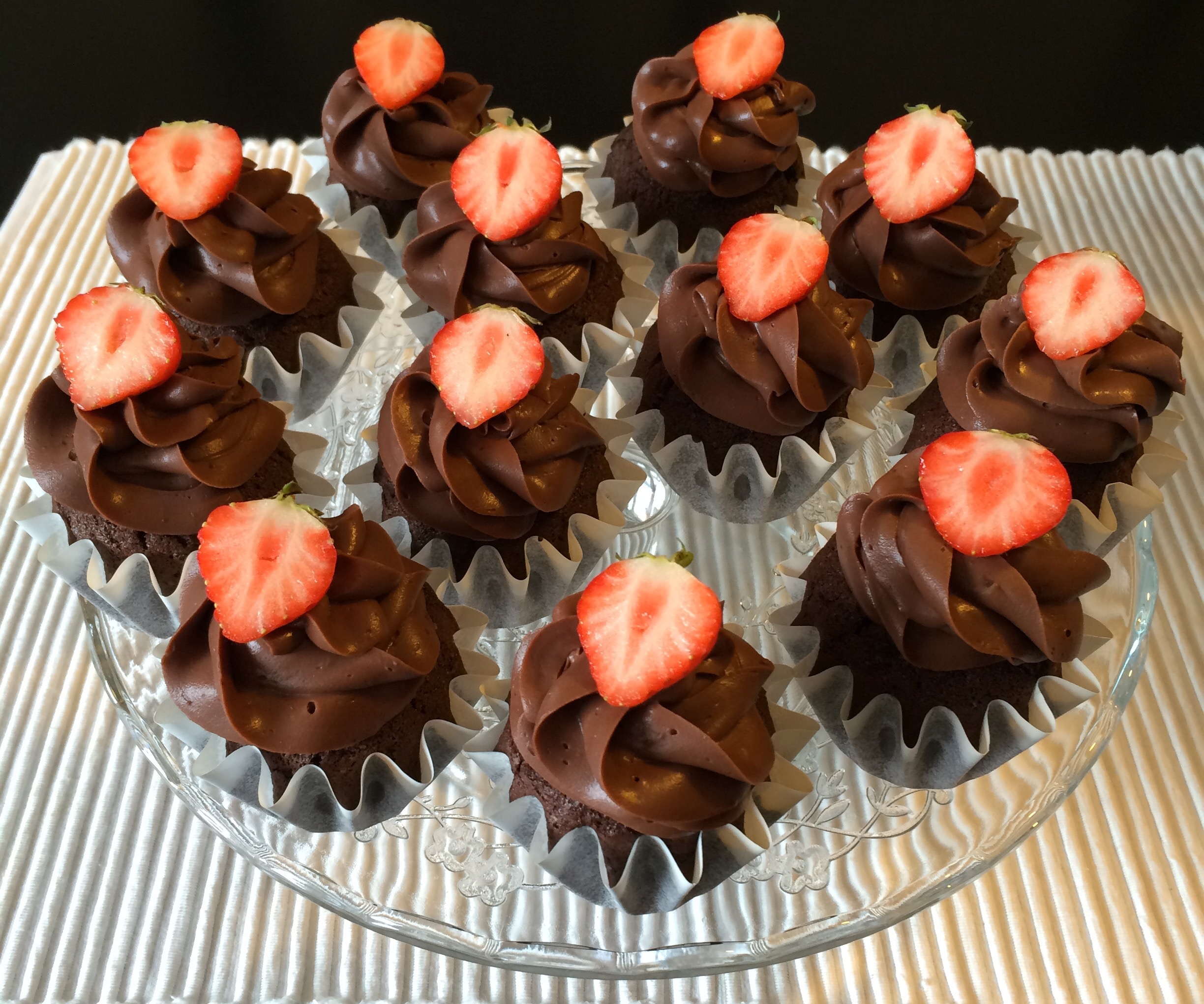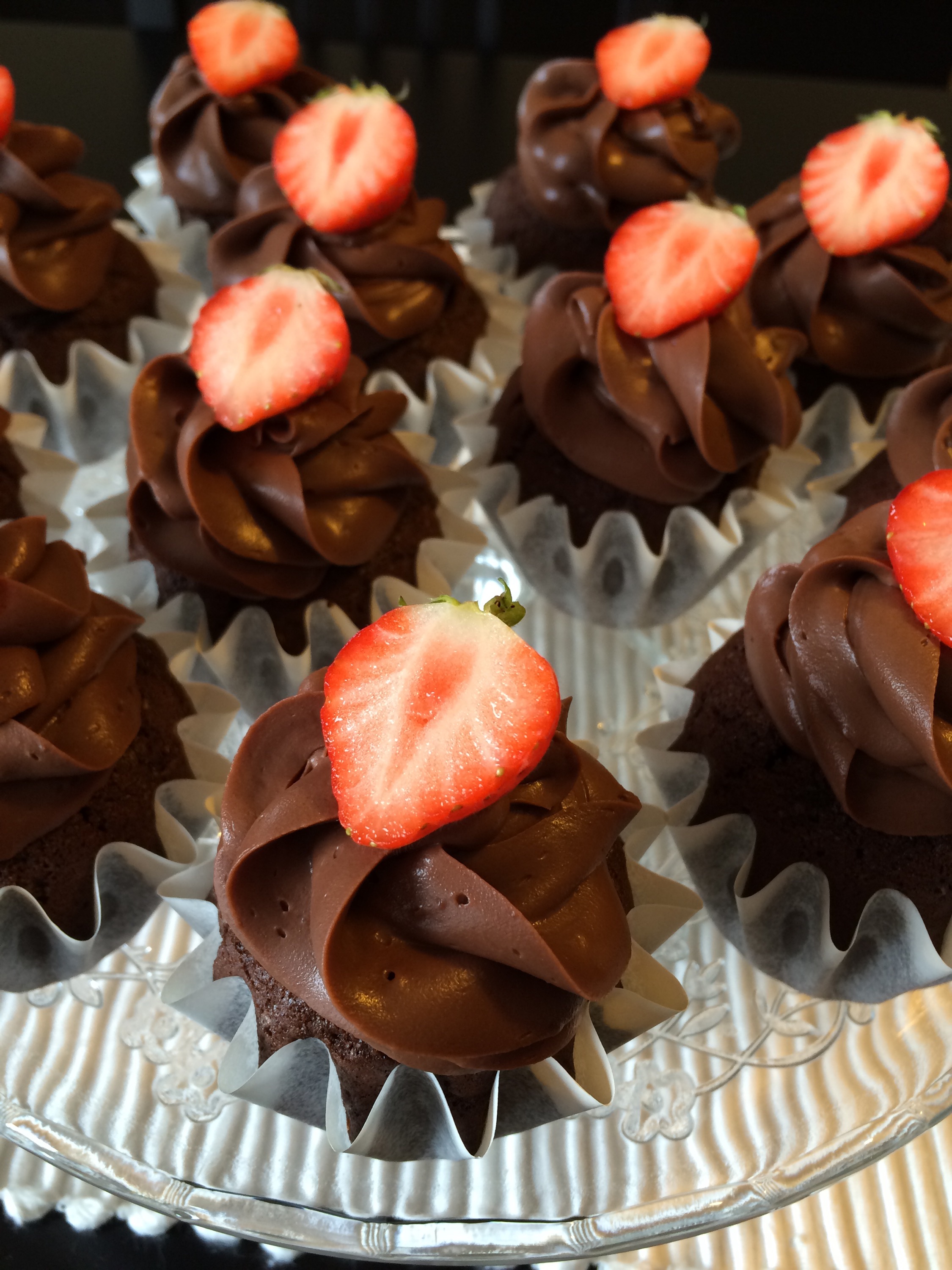 Det er helg. Who am I kidding, jeg baker uken rundt, men i dag har jeg bakt fordi det er helg 😉 Jeg hadde litt sjokoladeganache til overs etter gårsdagens kake, men den hadde nå stått kaldt over natten og kunne piskes opp til tykk frosting. Denne ble utgangspunktet for dagens bakst, som altså ble sjokoladecupcakes (Annas favorittsjokoladekake) toppet med sjokoladeganache og jordbær.