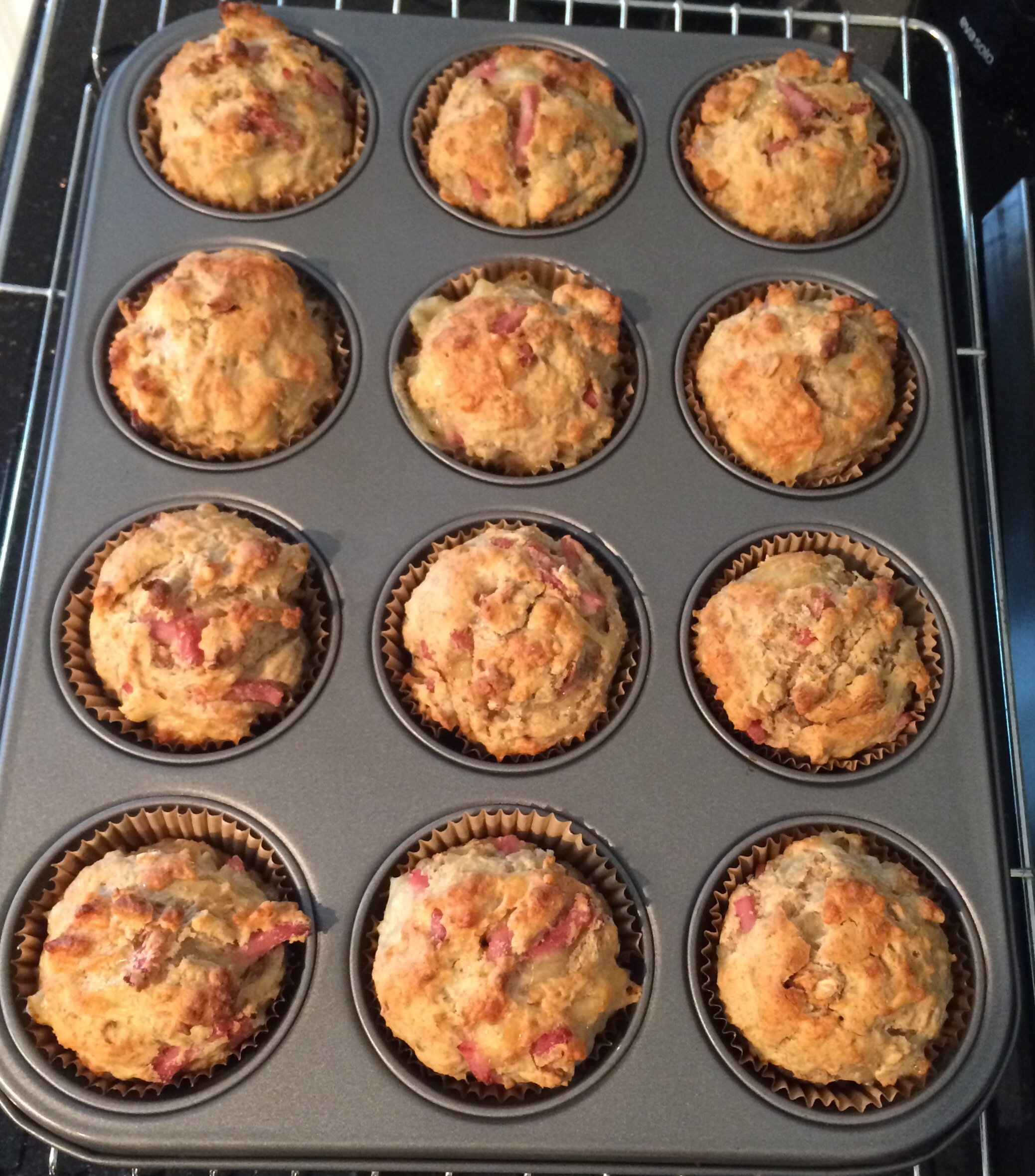 Bland sammen det tørre, smelt smøret og bland med melk og egg. Alt blandes sammen før ost og skinke vendes inn. Ha i muffinsformer plassert i muffinsbrett. Isskje er genialt til å fordele røren (deigen..) Stekes ved 250 grader midt i ovnen i 13-15 minutter.