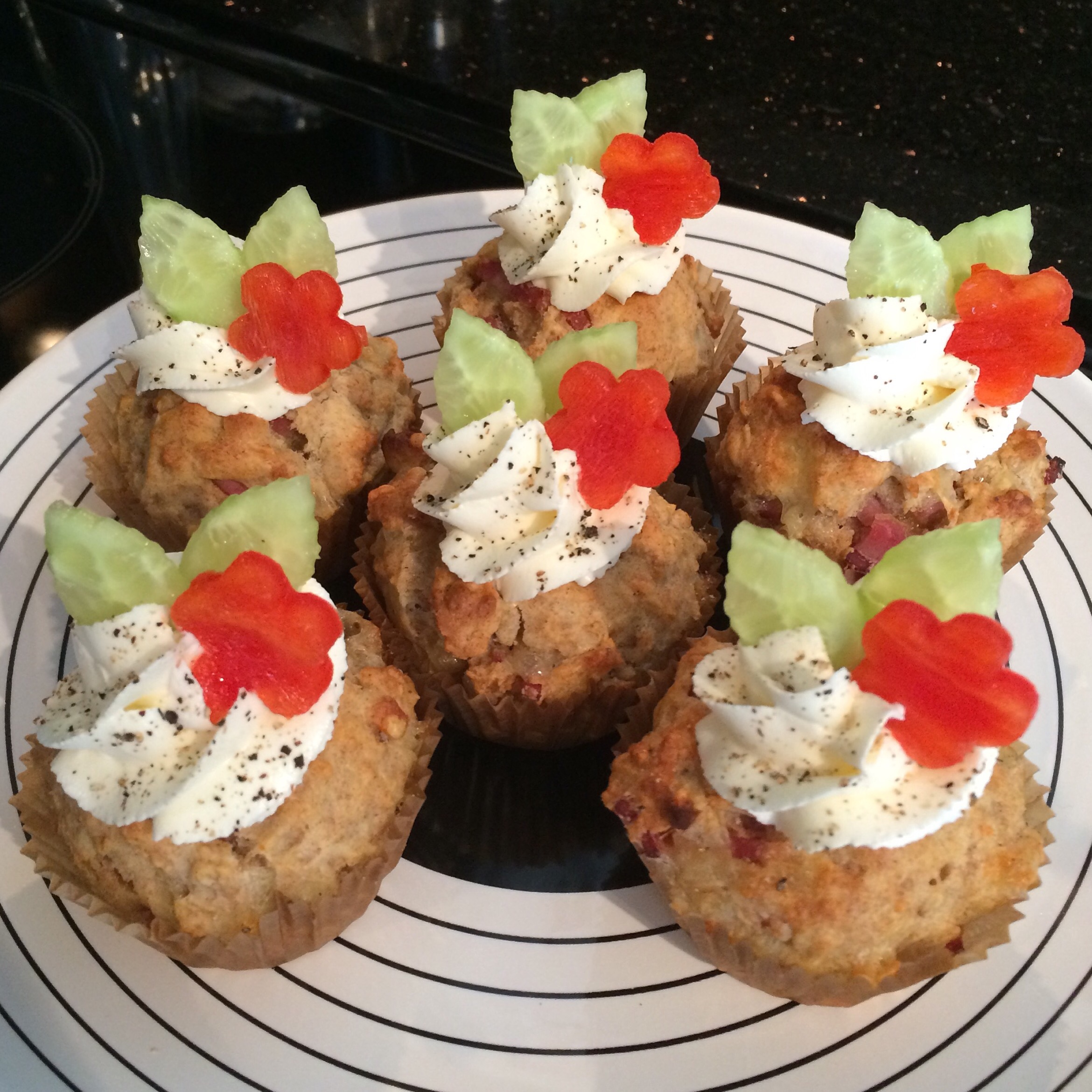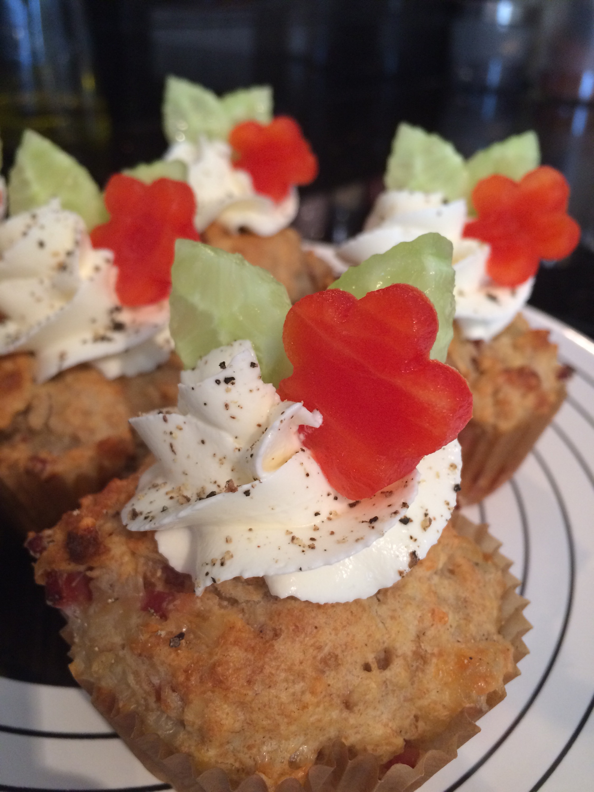 Jeg toppet mine med en liten «klatt» Philadelphia, en paprikablomst og agurkblader, samt et lite pepperdryss. Pyntes det som pyntes kan!