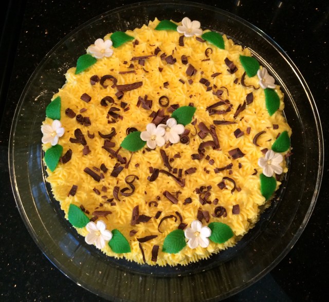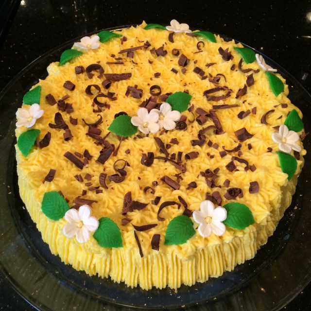 Denne gangen valgte jeg å lage dobbel porsjon av bunnen for å lage kaken med to lag, og laget halvannen porsjon krem, slik at det ble et tynt lag mellom, og et tykkere, pyntet lag utenpå og på sidene. Kaken ble pyntet med marsipanblomster og høvlet sjokolade.
