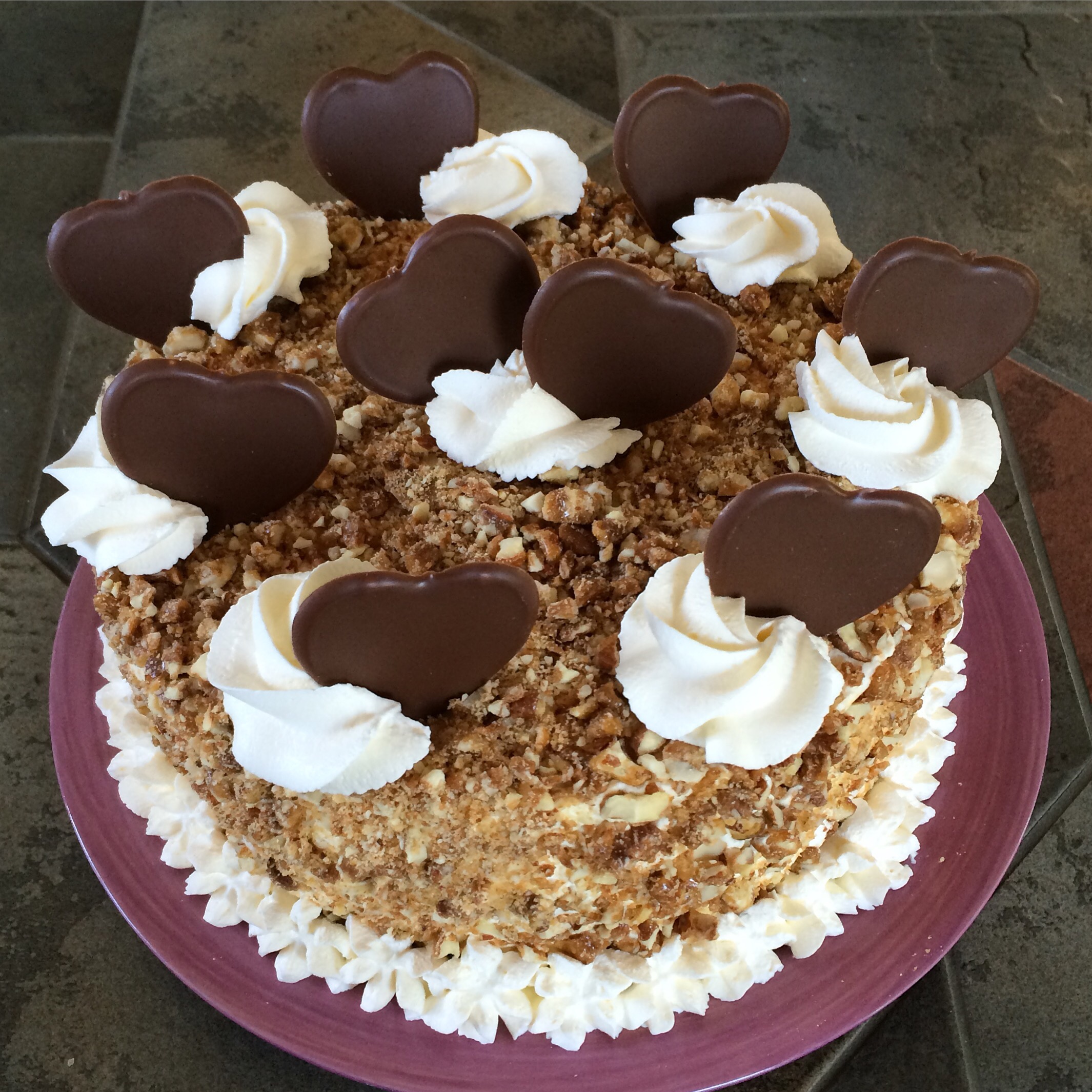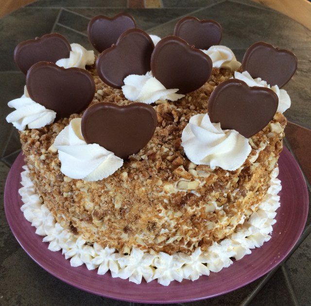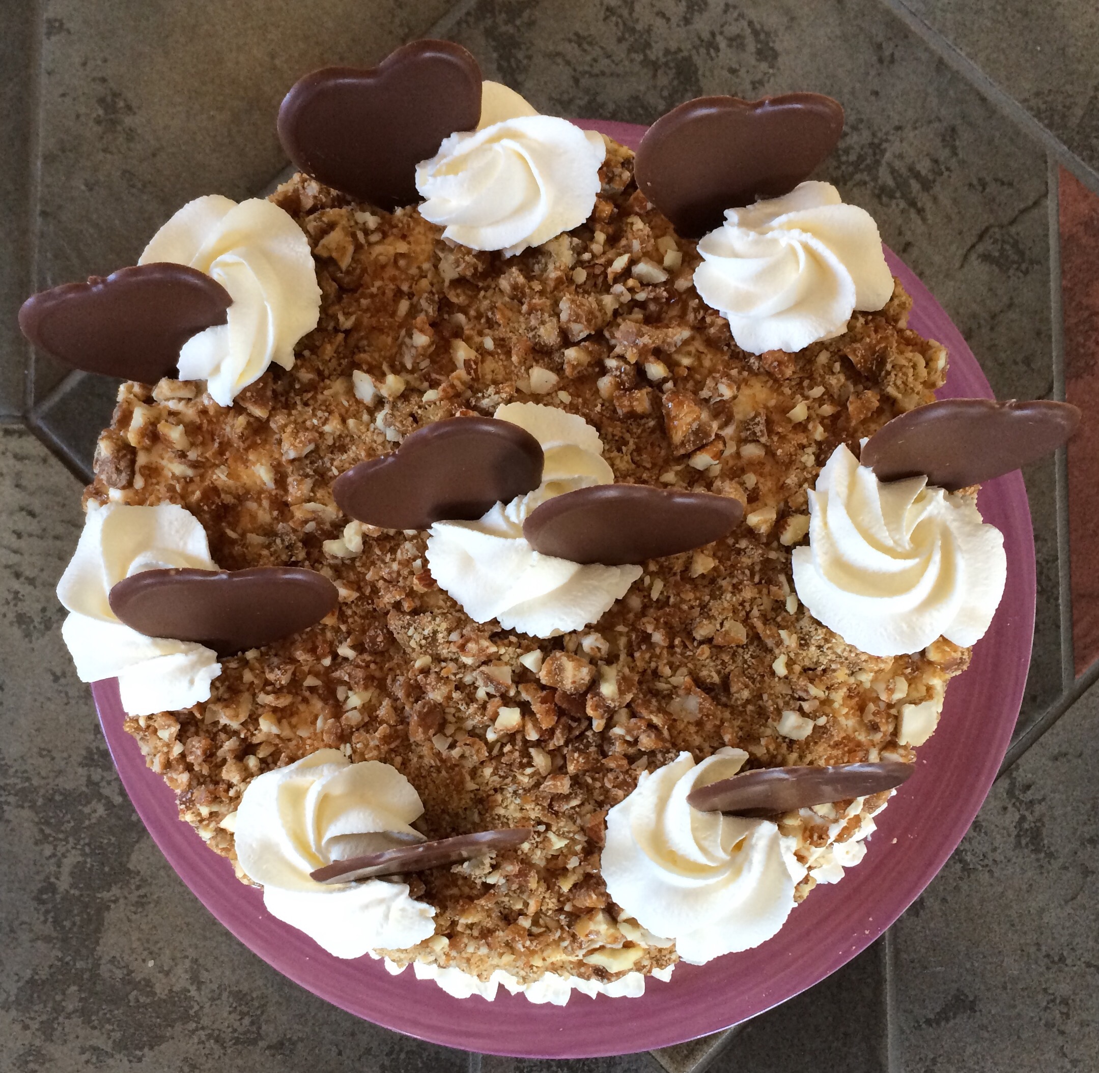 Jeg brukte Nettbakerens sukkerbrød i 22 cm form (brukte oppskrift til 24 cm for å få litt høyde, bygde som vanlig opp kantene på formen med bakepapir), dynket med litt fløte, og fylte med fløtekrem med en dæsj vaniljesukker og hakket krokan. Til slutt dekket jeg hele utsiden av kaken med et lag krem og krokan. Pyntet med noen kremswirls og melkehjerter.  Jeg brukte 3,5 små fløteputter à 3 dl i denne kaken, da med tre lag fyll, oppsmøring og krempynt.