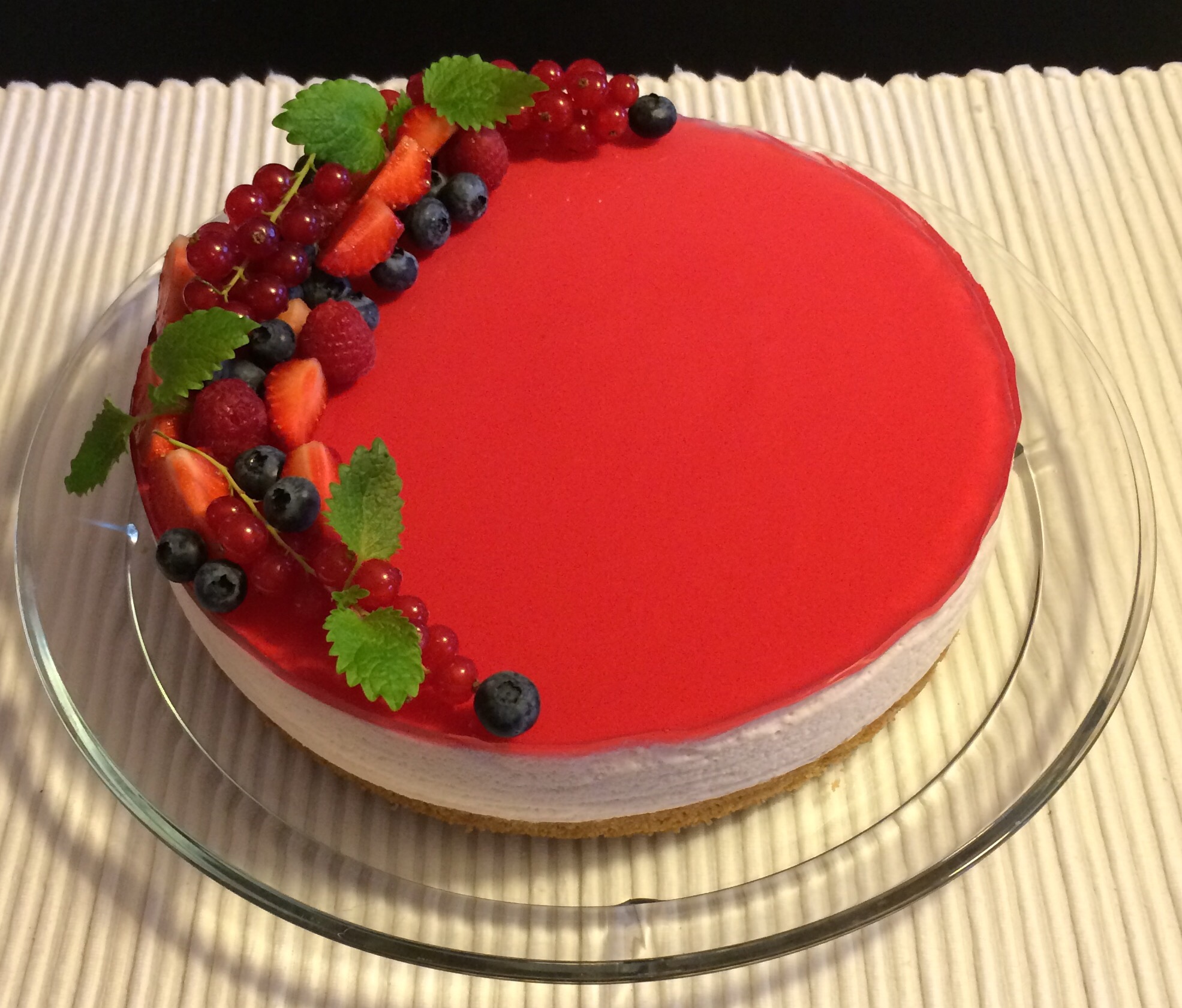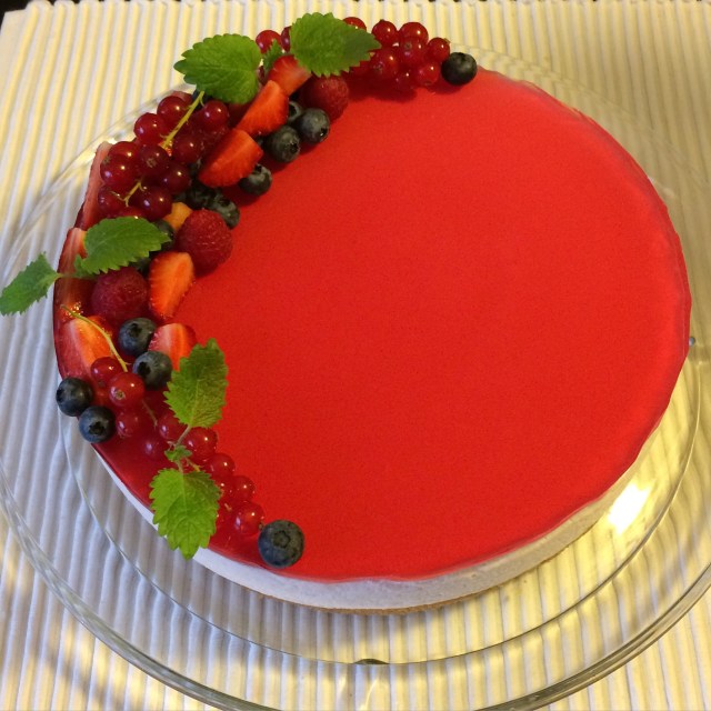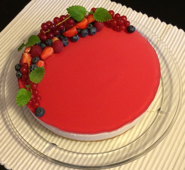 Denne gangen byttet jeg ut sitrongeleen i ostekremen med jordbærgele for å få en annen smaksopplevelse, og dette fungerte utmerket! Jeg pyntet kaken med masse friske bær, som seg hør og bør på denne tiden av året!
