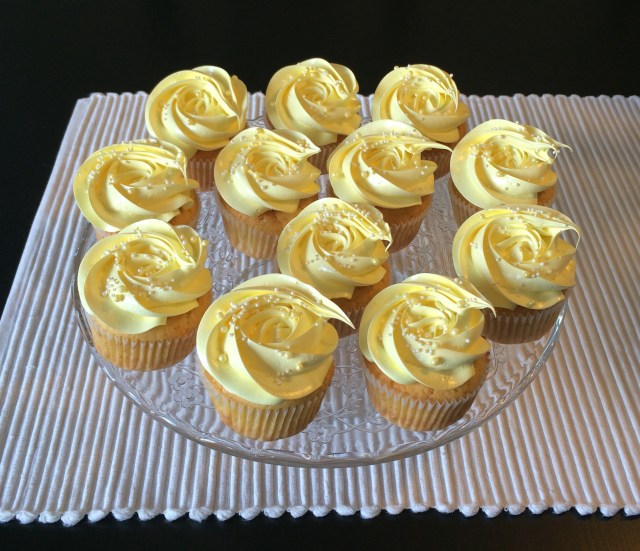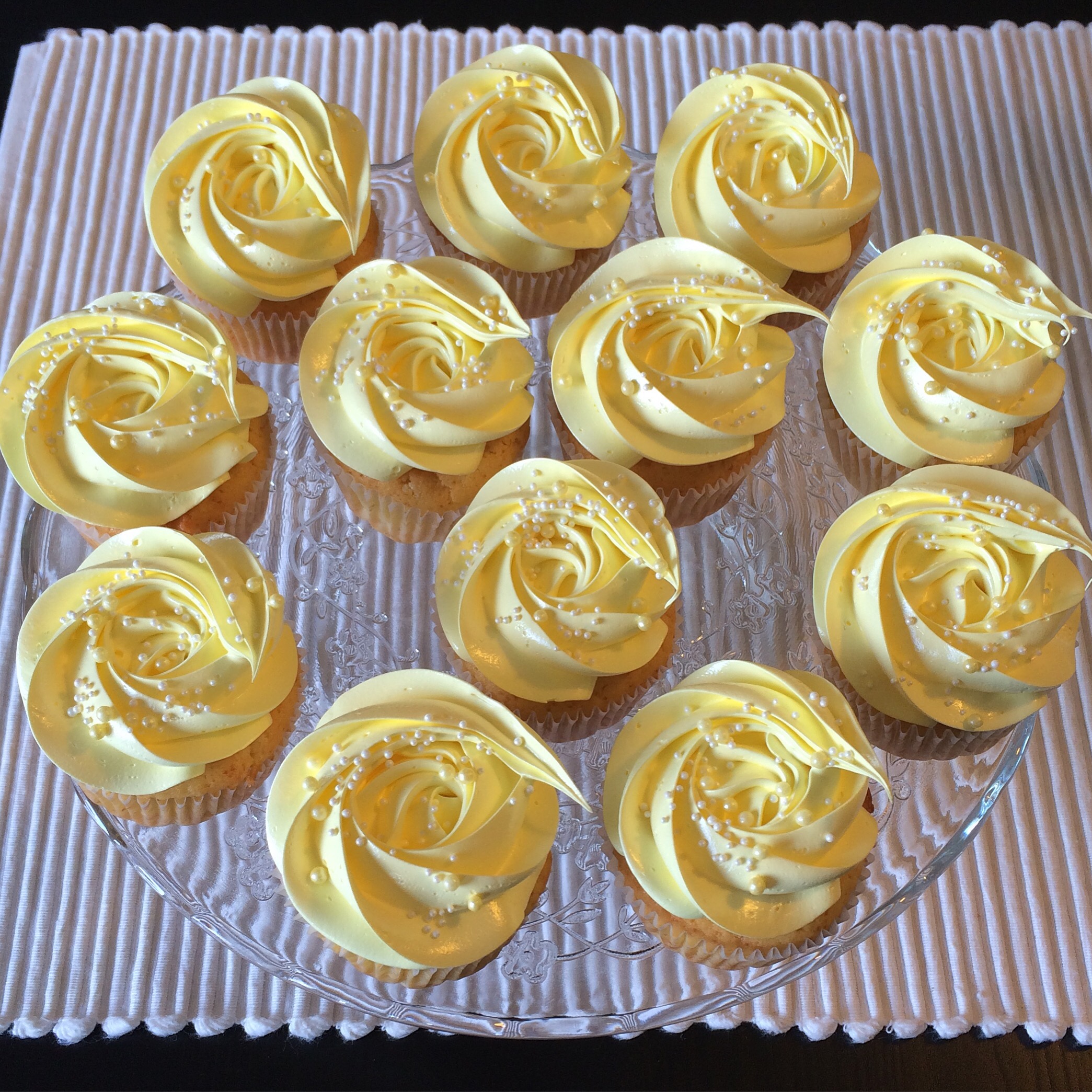 En enkel variant av lemon meringue dette. Smakskombinasjonen syrlig-søtt er skikkelig god. Jeg brukte min vanlige vaniljecupcake-oppskift og tilsatte revet skall og saft fra en sitron for å oppnå friskheten i bunnene. Toppingen er denne fra Passion4baking: