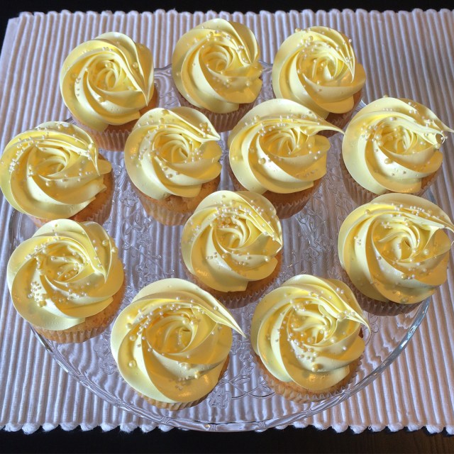 Disse ble veldig gode, selv om de ikke kan måle seg med lemon meringue-cupcakesene jeg har laget tidligere, med lemoncurd-kjerne og flambert marengstopp. Men definitivt et godkjent hurtigalternativ. Og toppingen er sååå grei å sprøyte pent! 🙂