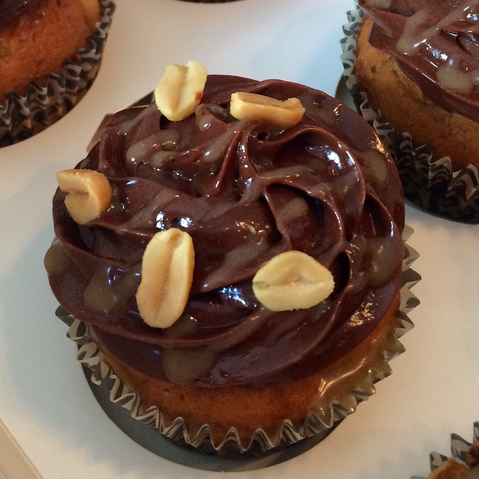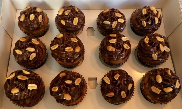 Eller en Snickers-cupcake. Personlig liker jeg hverken peanøtter eller Snickers, men mannen er veldig glad i det, så disse trengte jeg ekstra «publikum» for å lage. Det ble derfor bestemt at kollegene til min mann skulle være prøvekaniner for disse cupcakesene. Tøff jobb, men noen må gjøre den 😉