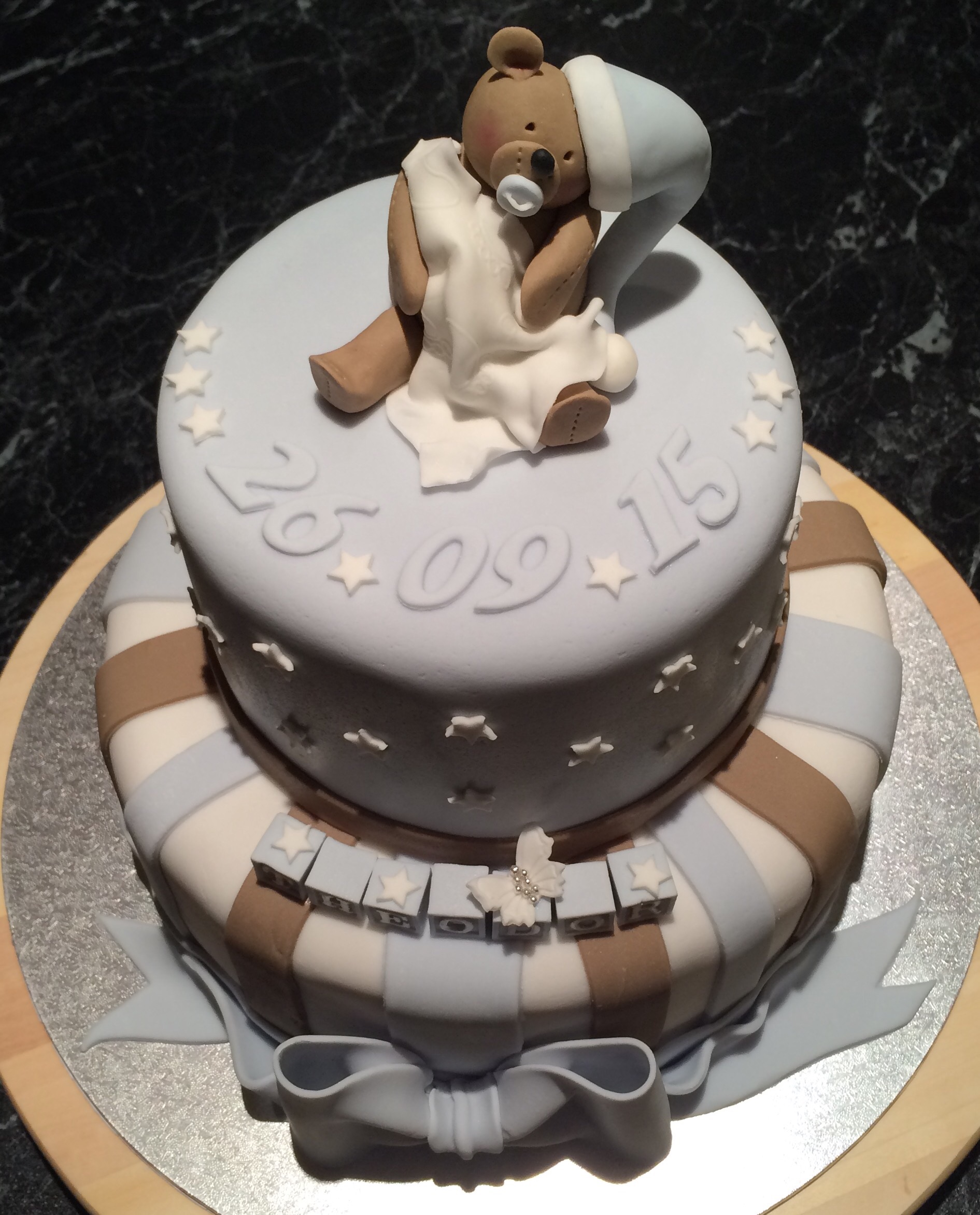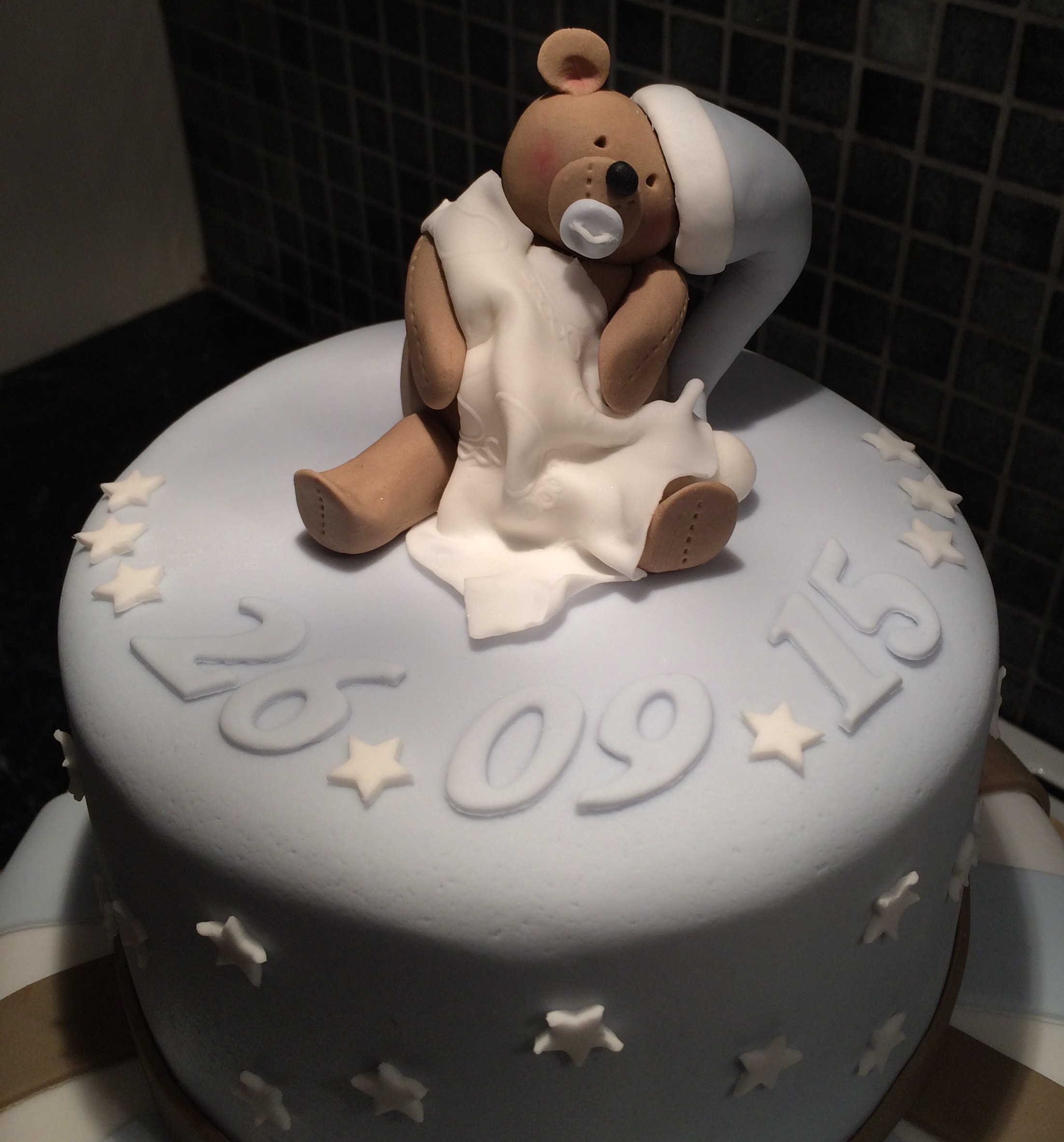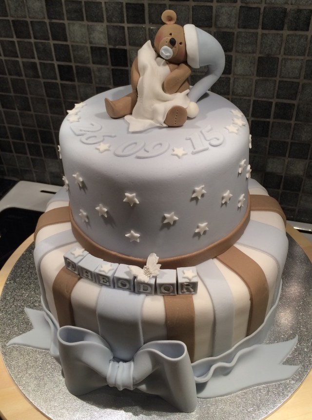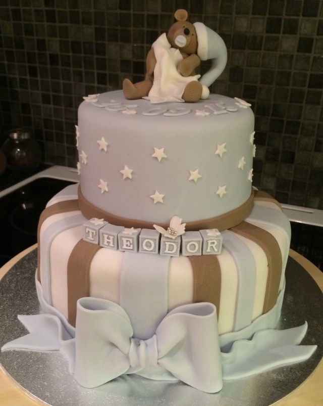 Forrige helg var vi i Stavanger i anledning to barnedåper. Virkelig perfekt timing å få begge samme helg 😀 Først ut var dåpen til den lille gutten til en god venninne på lørdagen. Søte Theodor, Teddy, måtte selvsagt få en kake med teddybjørn. Min venninne ville gjerne ha blå og brun som fargetema for kaken, og hun er veldig glad i stjerner, så dette ble utgangspunktet for kaken. Fant også mye inspirasjon i en av kakene til Iselins kaker 🙂