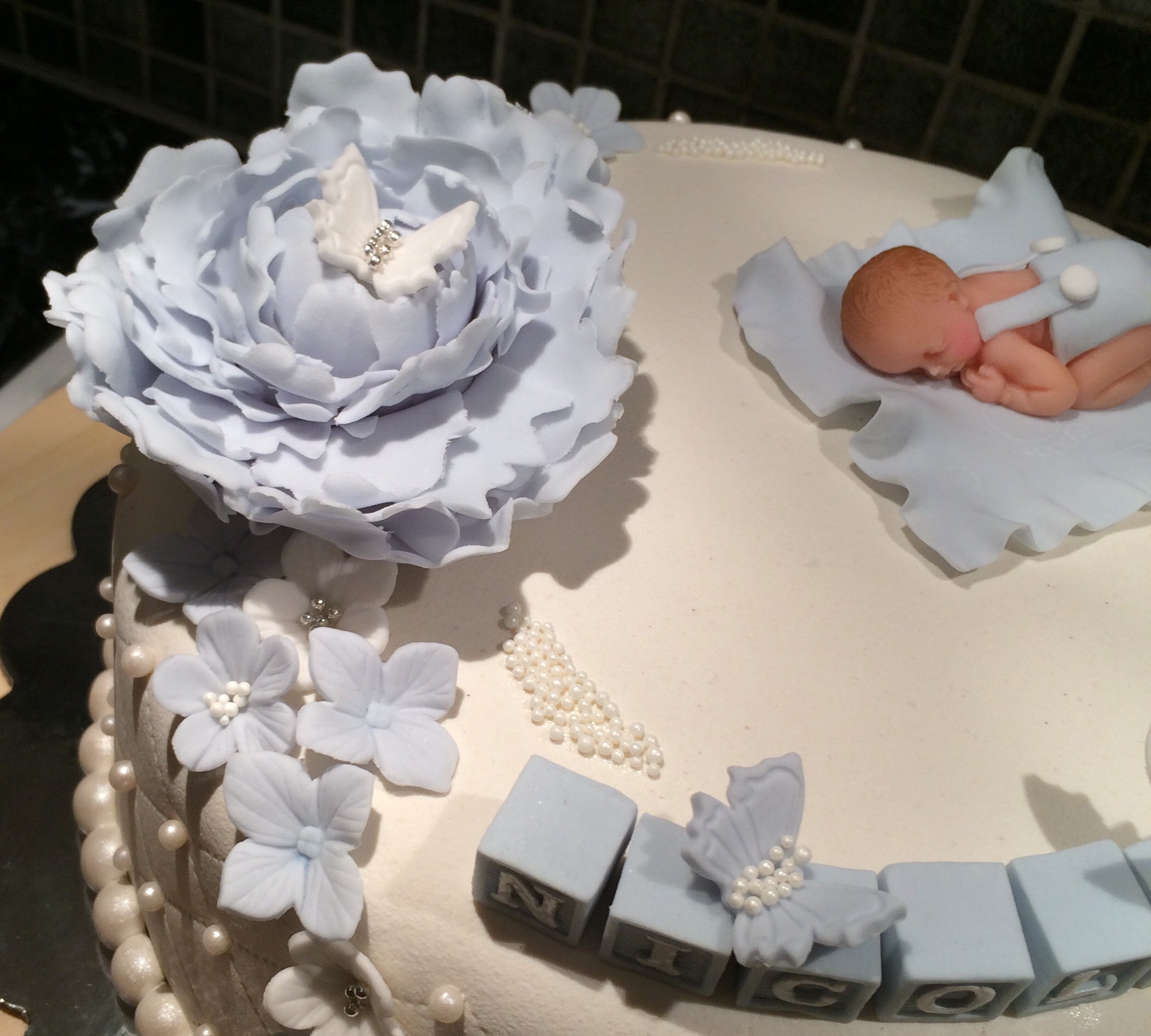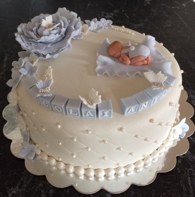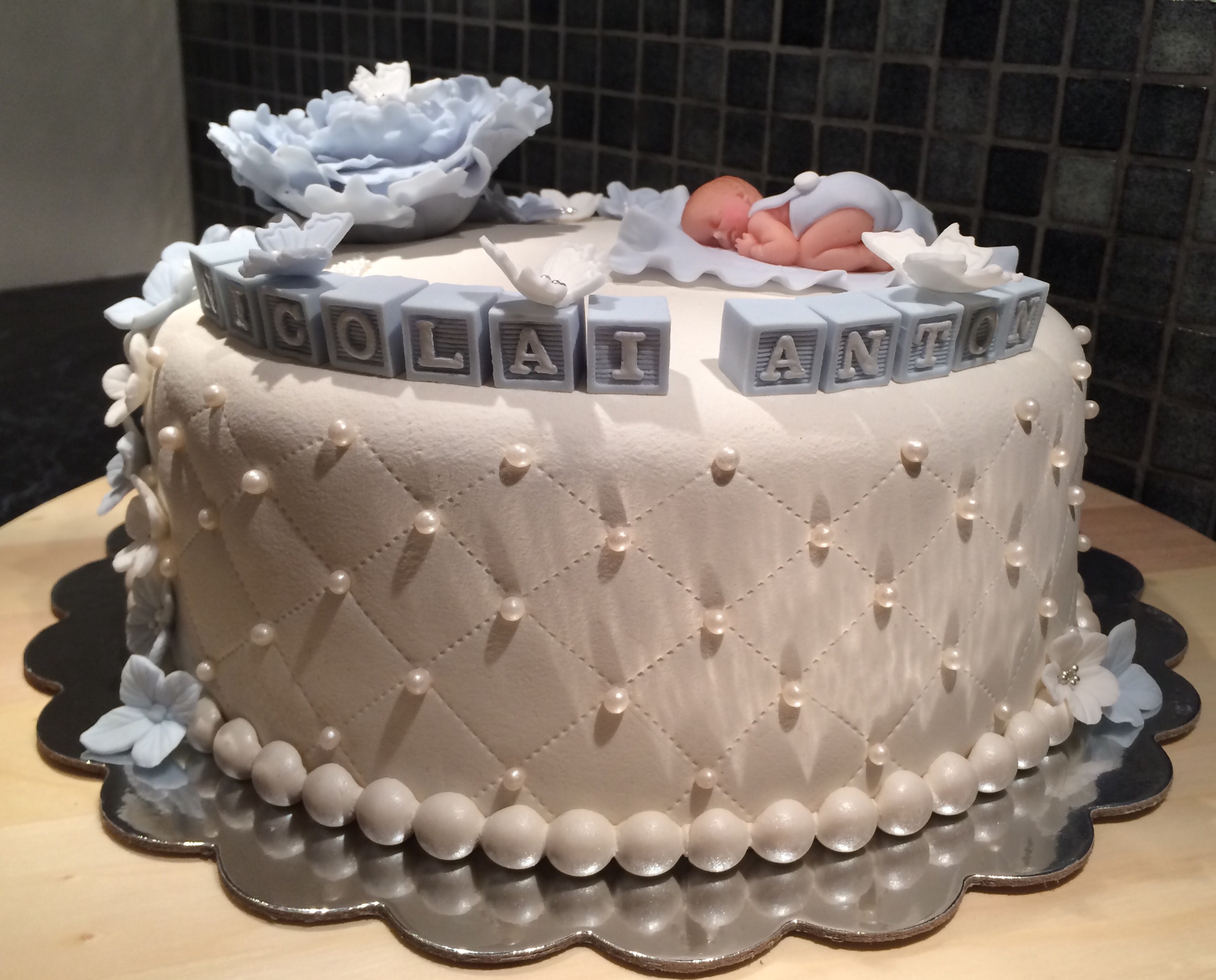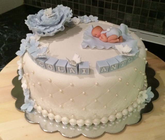 Andre dåpsbarn forrige helg var mitt tantebarn Nicolai. Her hadde jeg temmelig frie tøyler, med unntak av fargen og navneklossene, så jeg benyttet sjansen til å prøve med på en peon av sukkerpasta for første gang.