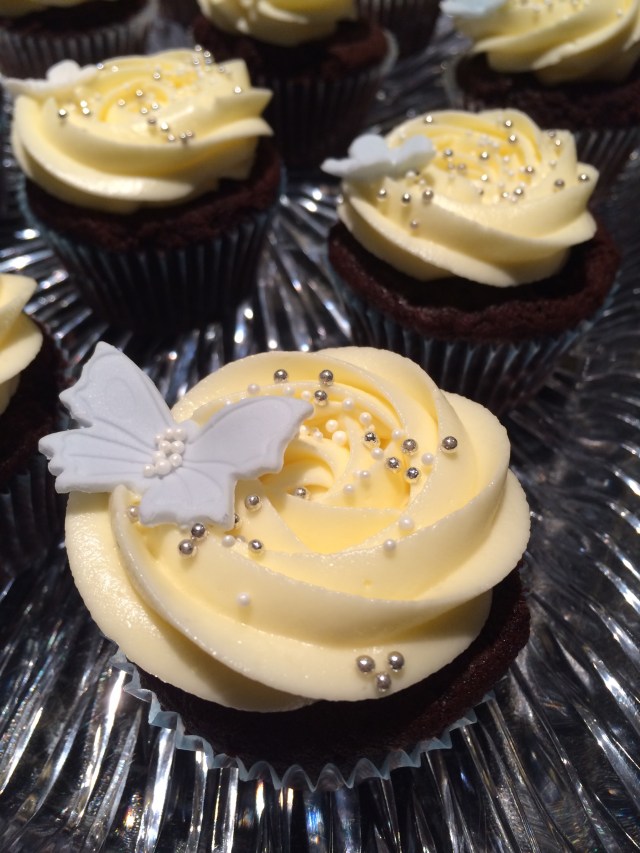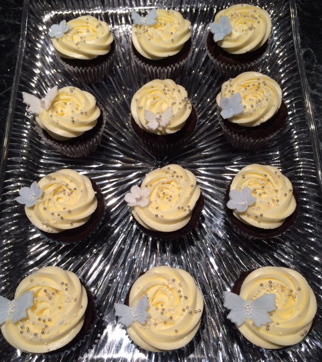 Jeg kastet også sammen noen matchende cupcakes. Sjokoladecupcakes med saltkaramell-kjerne, toppet med ostekrem, perler og sukkerpastapynt.