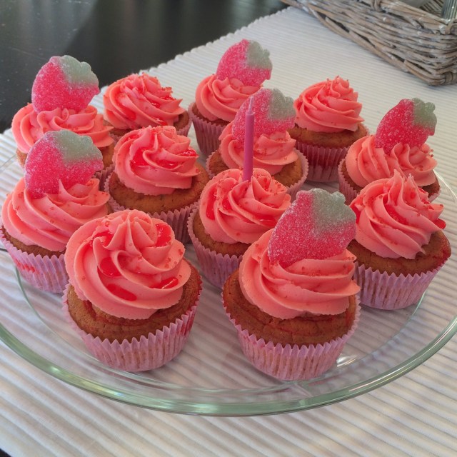 Til hjemmebruk på selve bursdagen laget jeg vanilje og jordbærcupcakes.