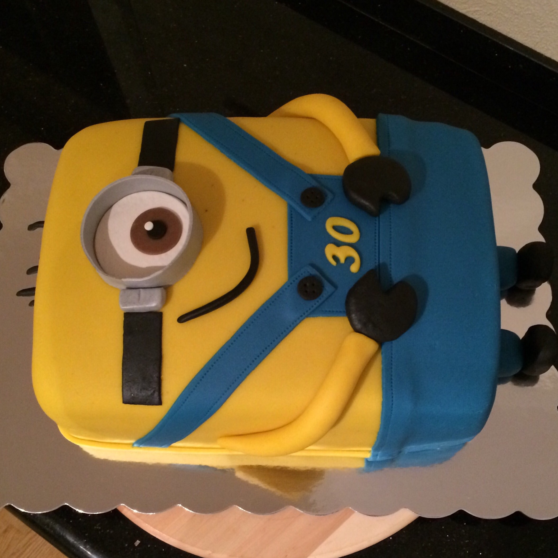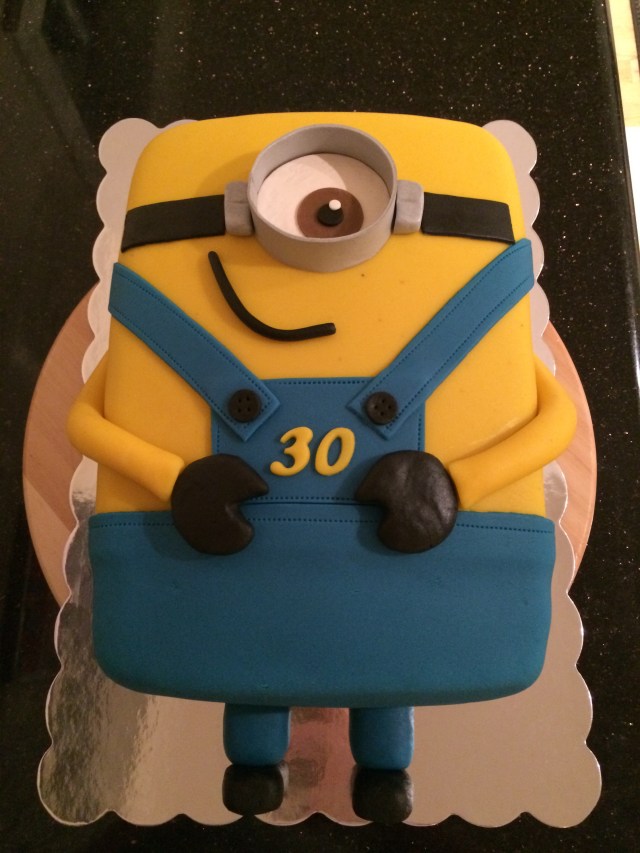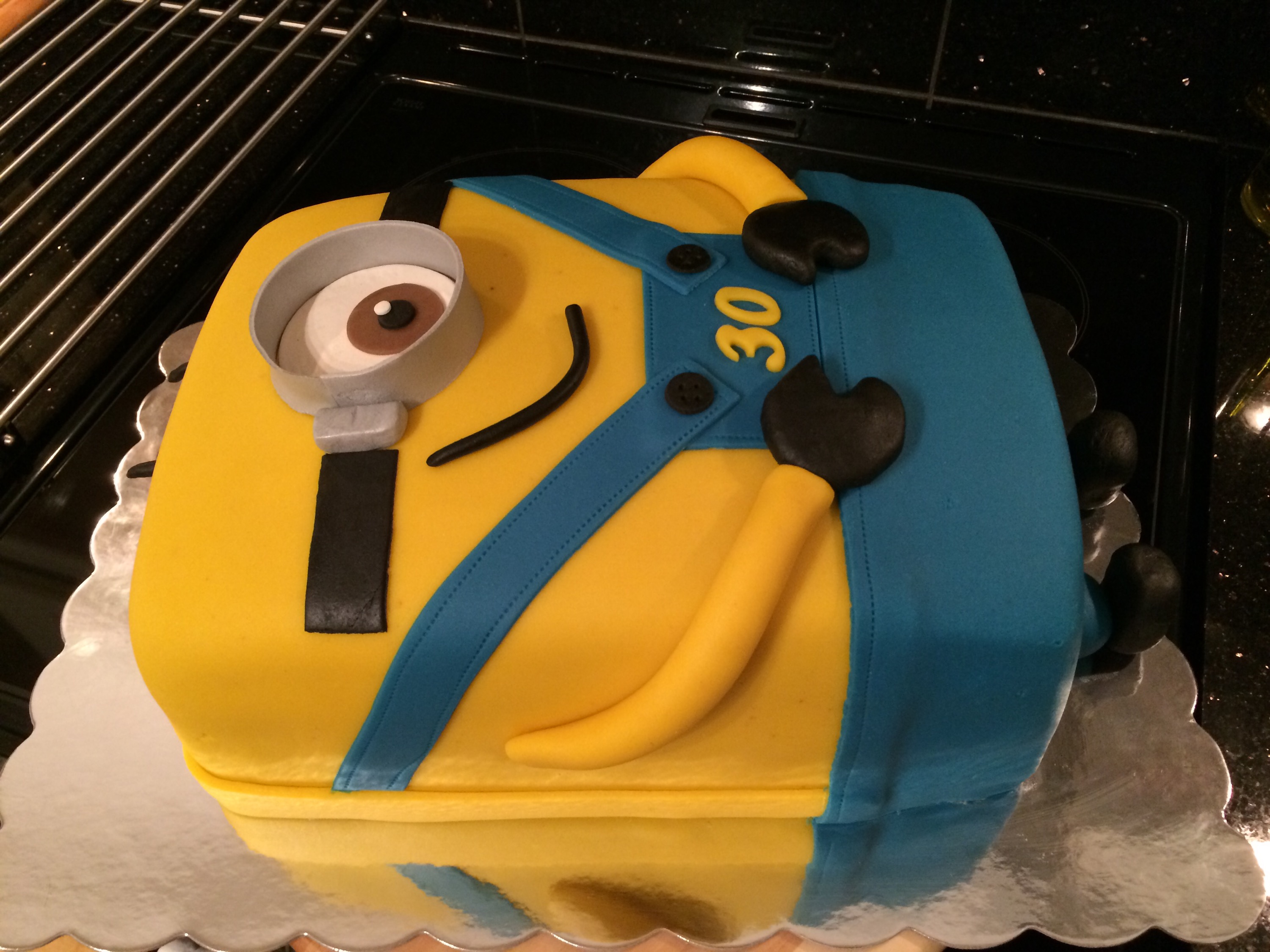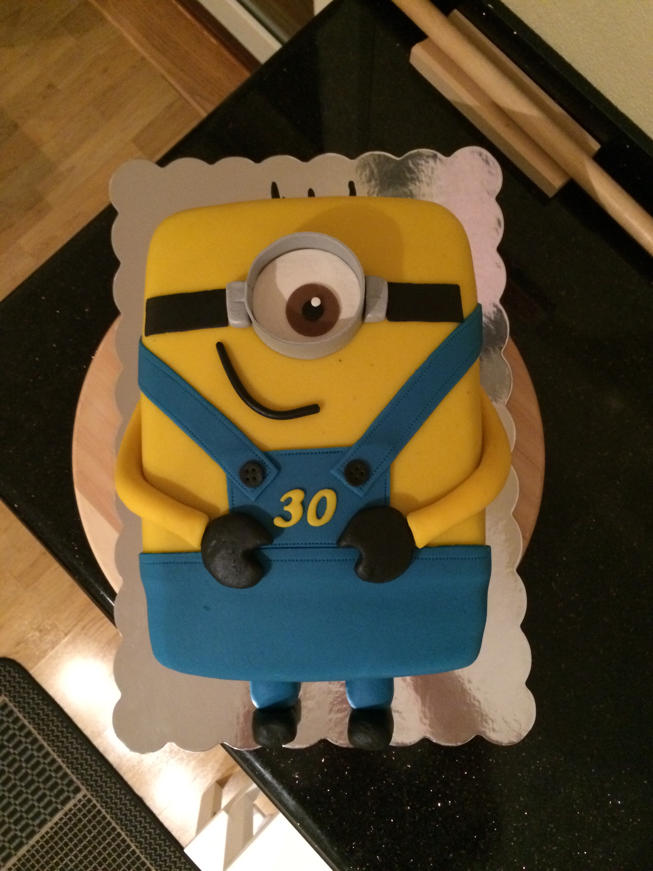 Min mann fylte 30 år 28 oktober, og i den anledning ble det mye baking. Til å ha med på jobbfeiringen sin sa han at han ønsket seg en Minion. Jeg slet litt med å ta det på alvor, men her i huset får man de kakene man bestiller 😉 Vår yngste datter på 1,5 år snakker nesten ikke, men Minion kan hun si, og hun ble ganske hissig over å ikke få hilse nærmere på denne kaken før den forsvant ut døra.