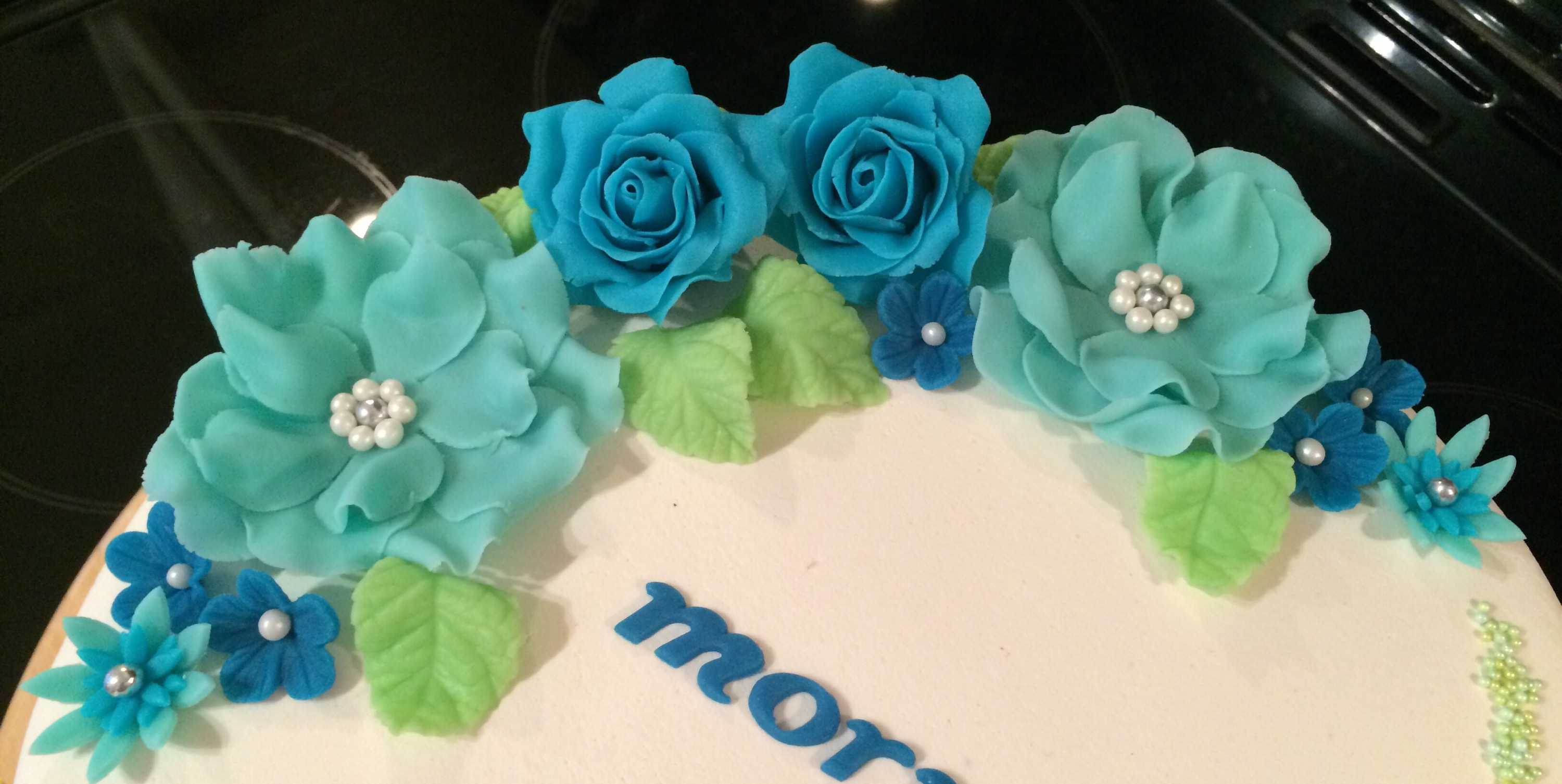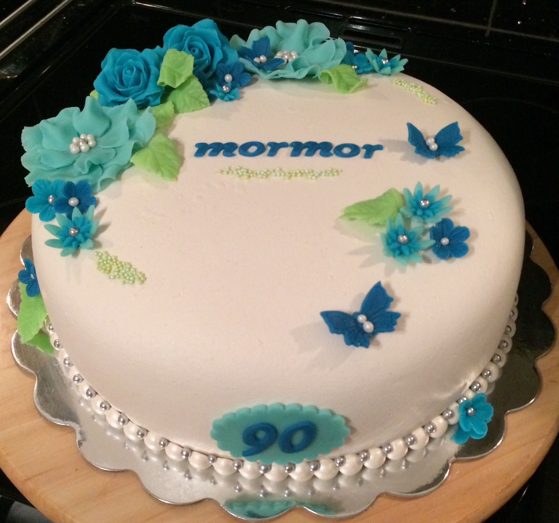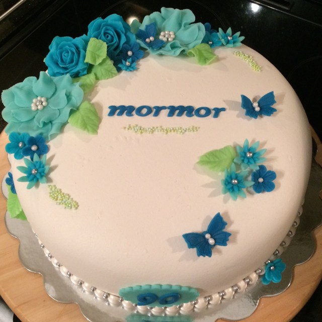 Utseendemessig gikk jeg for ulike blomster i turkise nyanser. I grunn veldig ulik de fleste andre kaker jeg har laget, spesielt fargemessig. Brukte noen grønne blader innimellom det turkise for litt friskhet og kontrast, og synes det passet veldig fint sammen. Foran på kaken er et lite skilt med «90» på, og hun ønsket at det skulle stå «mormor» i stedet for navn på kaken.