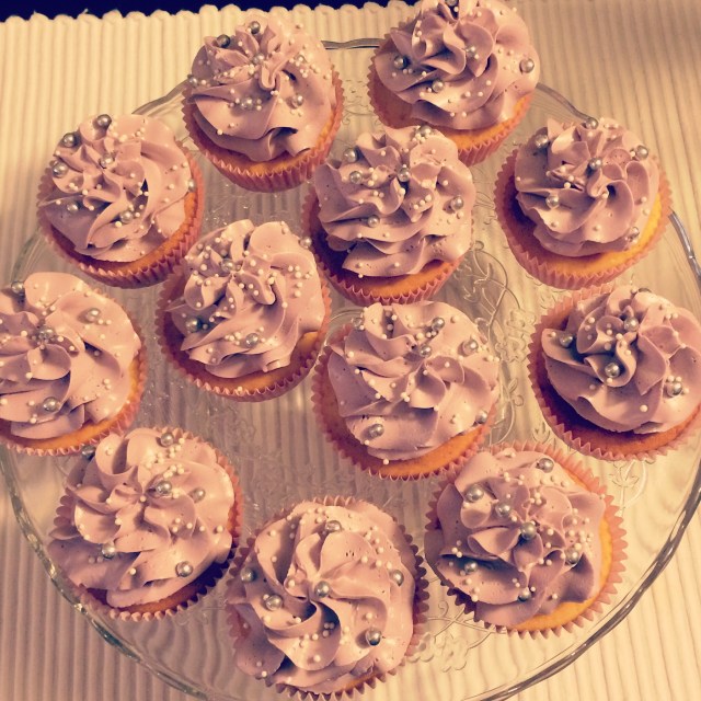Først laget jeg vaniljecupcakes toppet med dus lilla swiss meringue buttercream. Oppskrift på kremen finnes bl.a her: