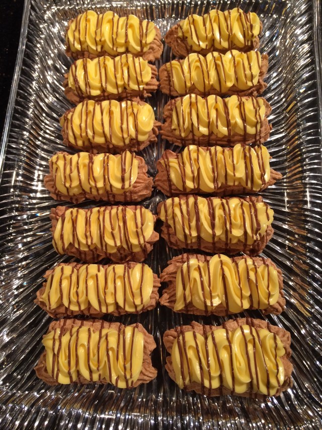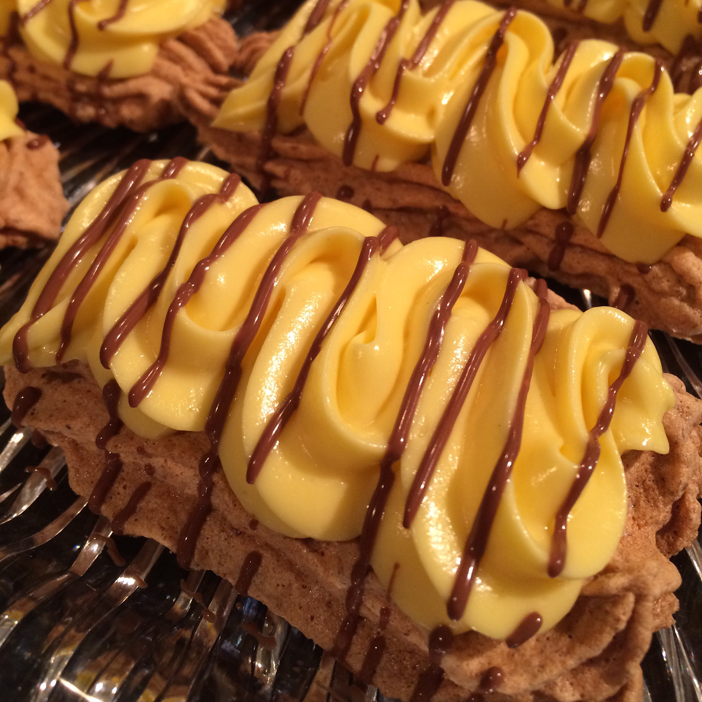 Men i stedet for en stor form, hadde jeg røren i en sprøytepose og sprøytet to streker på rundt ti cm tett inntil hverandre. Sprøytet så to streker til oppå de første to for å oppnå ønsket høyde. Stekte på samme temperatur som vanlig, men satte timeren på halv steketid (15 min), og fulgte nøye med noen minutter til etter dette. Tok rundt 20 minutter totalt i min ovn, men pass på, ovner er forskjellige og det er bedre å begynne med litt kortere tid og ha kontroll 😉 Når de var ferdig stekt avkjølte jeg dem på rist før jeg toppet med kremen sprøytet på med tip 1M, og pyntet med litt smeltet sjokolade. Nam. Suksessterte er sååå godt. Kremrestene ble spist med skje rett fra bollen. Neida. Joda….