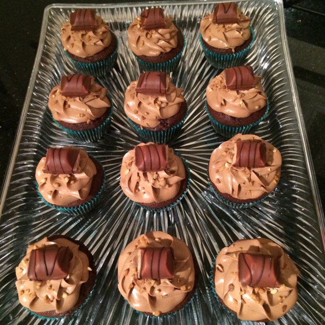 Her tok jeg utgangspunkt i Annas favorittsjokoladekake og stekte som cupcakes. Kremen lages enkelt ved å varme en liten boks fløte (3 dl) til kokepunktet, og helle over 200 g bløt nougat. Rør til alt er oppløst, og sett kaldt i minst 6 timer, helst over natten. Blandingen piskes så opp til fyldig krem. Jeg pyntet cupcakesene med litt hasselnøttkrokan (jeg kjøpte en boks på Meny, men kan fint lages selv hvis man ønsker det) og en rute Bueno som matcher smaken i cupcaken.