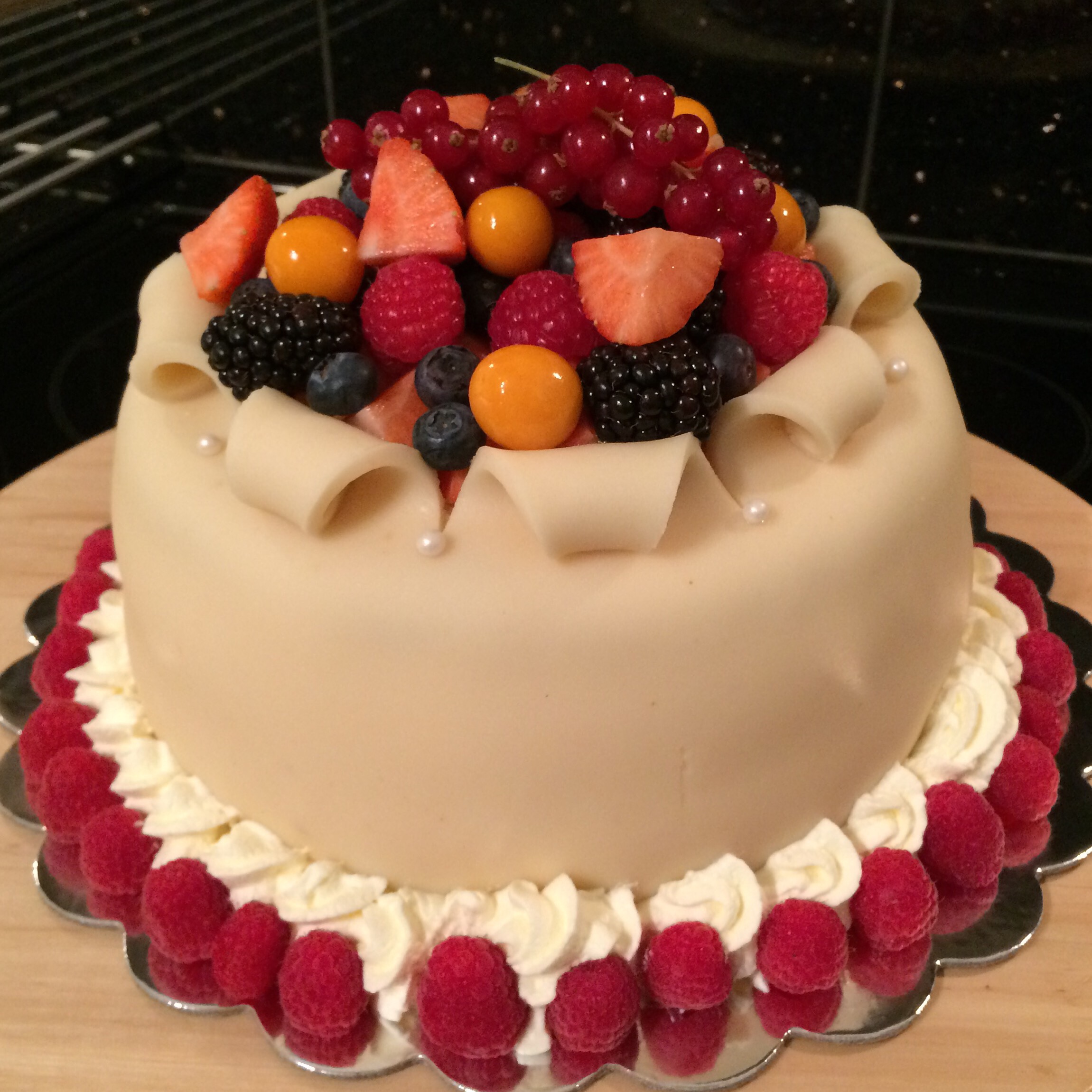 Bestående av sukkerbrød, fløtekrem, vaniljekrem, valnøtter, sjokoladebiter og rørte jordbær. Trekk av marsipan, og masse friske bær til pynt.