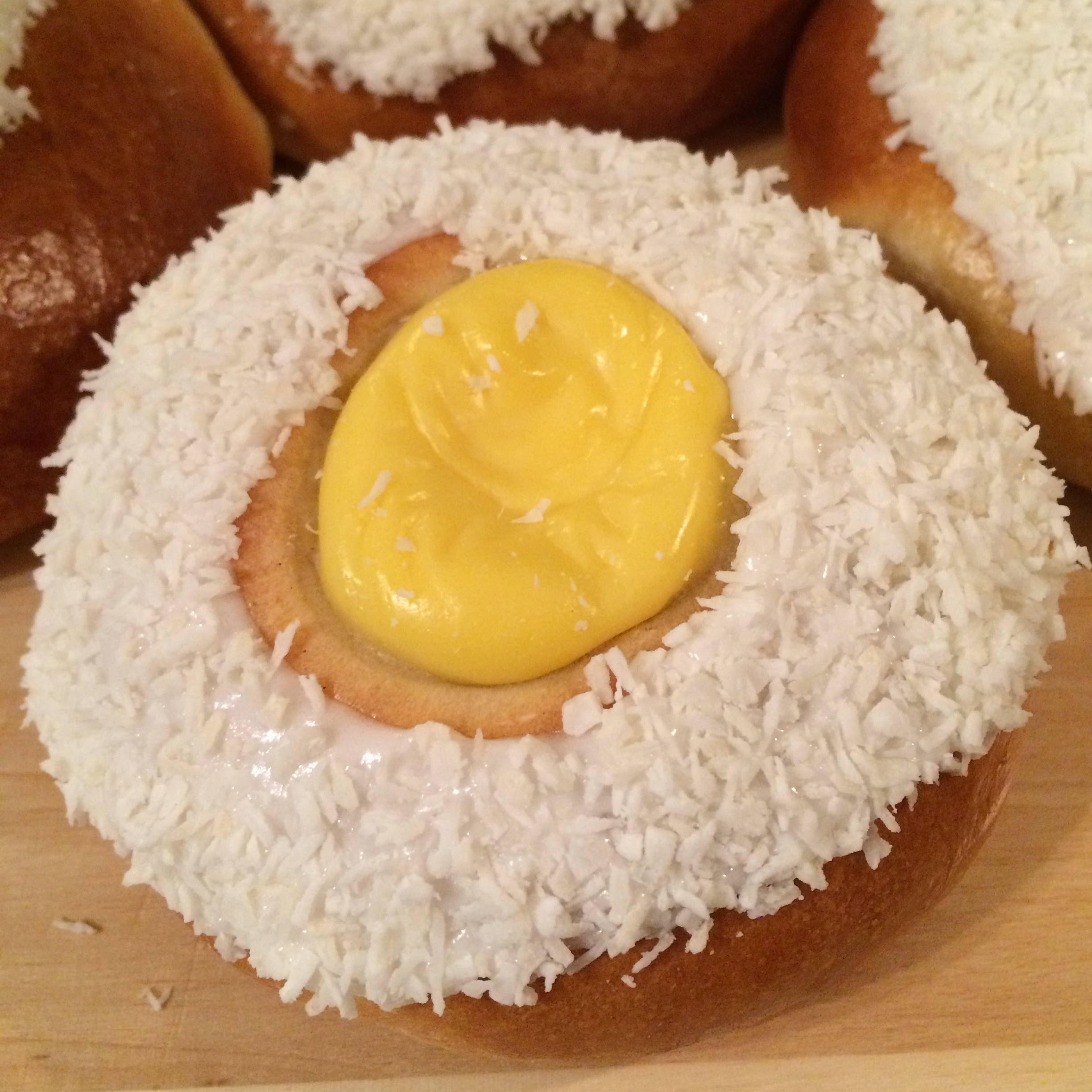 Her er deigen laget uten rosinene, men i stedet fylt med vaniljekrem, og toppet med melisglasur og kokos etter steking. Yam!