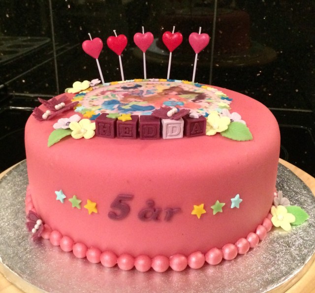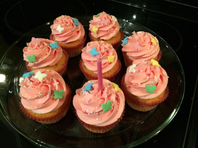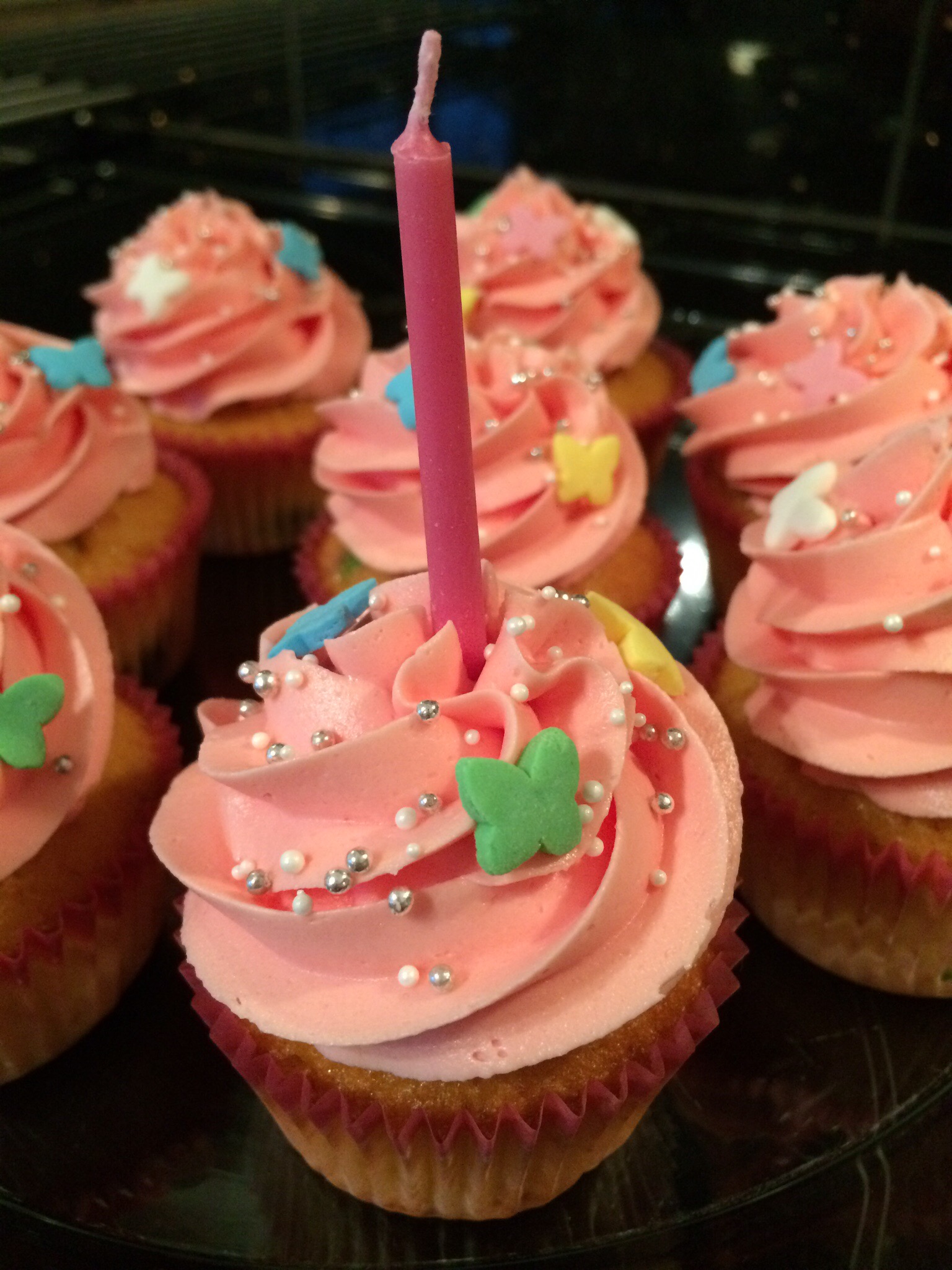 På nyttårsaften fyller vår eldste år, og denne gangen var det hele 5 år som ble feiret. Bakst til barnebursdager kommer gjerne i flere omganger, til feiring på selve dagen, noe godt å dele med barna i barnehagen, og for de som er gamle nok til det, barneselskapet. På selve dagen koste vi oss hjemme med litt besøk og vaniljecupcakes med Nonstop, toppet med hvit sjokoladekrem og sommerfugl-strøssel etter ønske fra bursdagsbarnet.