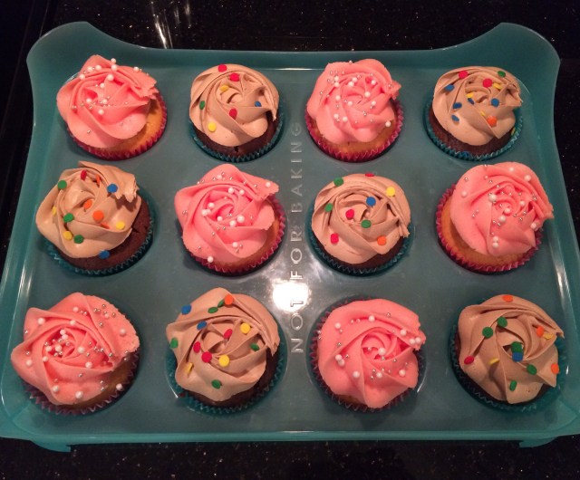 Når juleferien var over og det var på tide å komme tilbake til hverdagen og barnehagen fikk den ferske femåringen med seg cupcakes til vennene i også. Cupcakes er så praktisk til slike anledninger, passe porsjon til hver, og mindre gris enn kakestykker, fat og skje osv. Jeg lagde halvt om halvt med vaniljecupcakes (samme oppskrift som over, minus Nonstopen) toppet med jordbærsmørkrem av den syntetiske varianten (samme oppskrift som over, minus hvit sjokolade, og heller tilsatt noen dråper jordbæressens. For en voksnere smak kan man bruke bærpuré), og sjokoladecupcakes (Annas favorittsjokoladekake) med melkesjokoladekrem (samme oppskrift som over, men med melkesjokolade heller enn hvit).