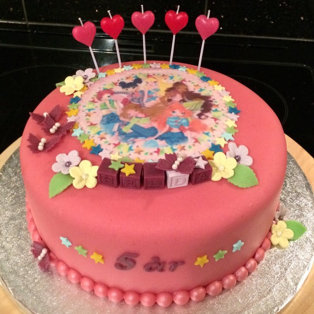 Sist, men ikke minst, det jeg bakte til barnebursdagen med 18 barn fra barnehagen. Hedda er veldig glad i serien Winx som går på Netflix, og ville ha Winxkake til bursdagen. Siden detaljerte feer og diverse ble litt heftig å skulle modellere, ble det spiselig bilde i tillegg til litt marsipanpynt. Jeg prøvde å si at klossene var mest for babykaker, men det var ikke bursdagsjenten enig i. Kaken er Annas favorittsjokoladekake med melkesjokoladekremen fra tidligere i innlegget og Nonstop. Trekk i marsipan.