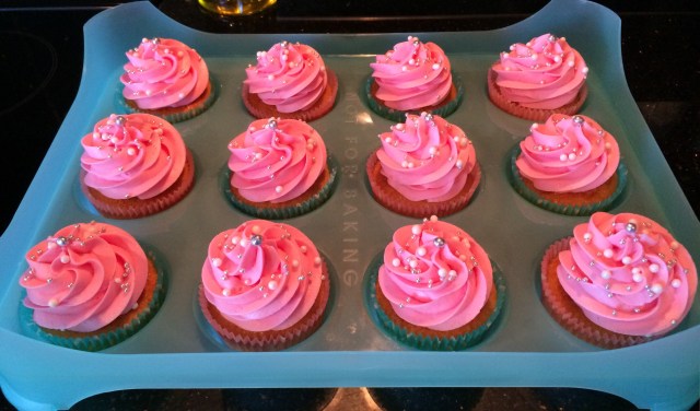 I tillegg lagde jeg vaniljecupcakes (oppskrift tidligere i innlegget) med rosa ostekrem og sukkerperler.