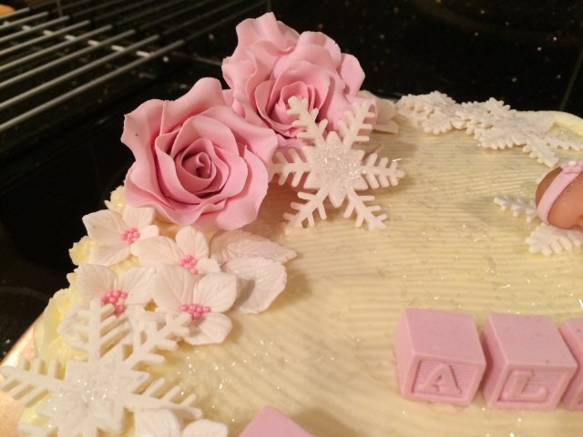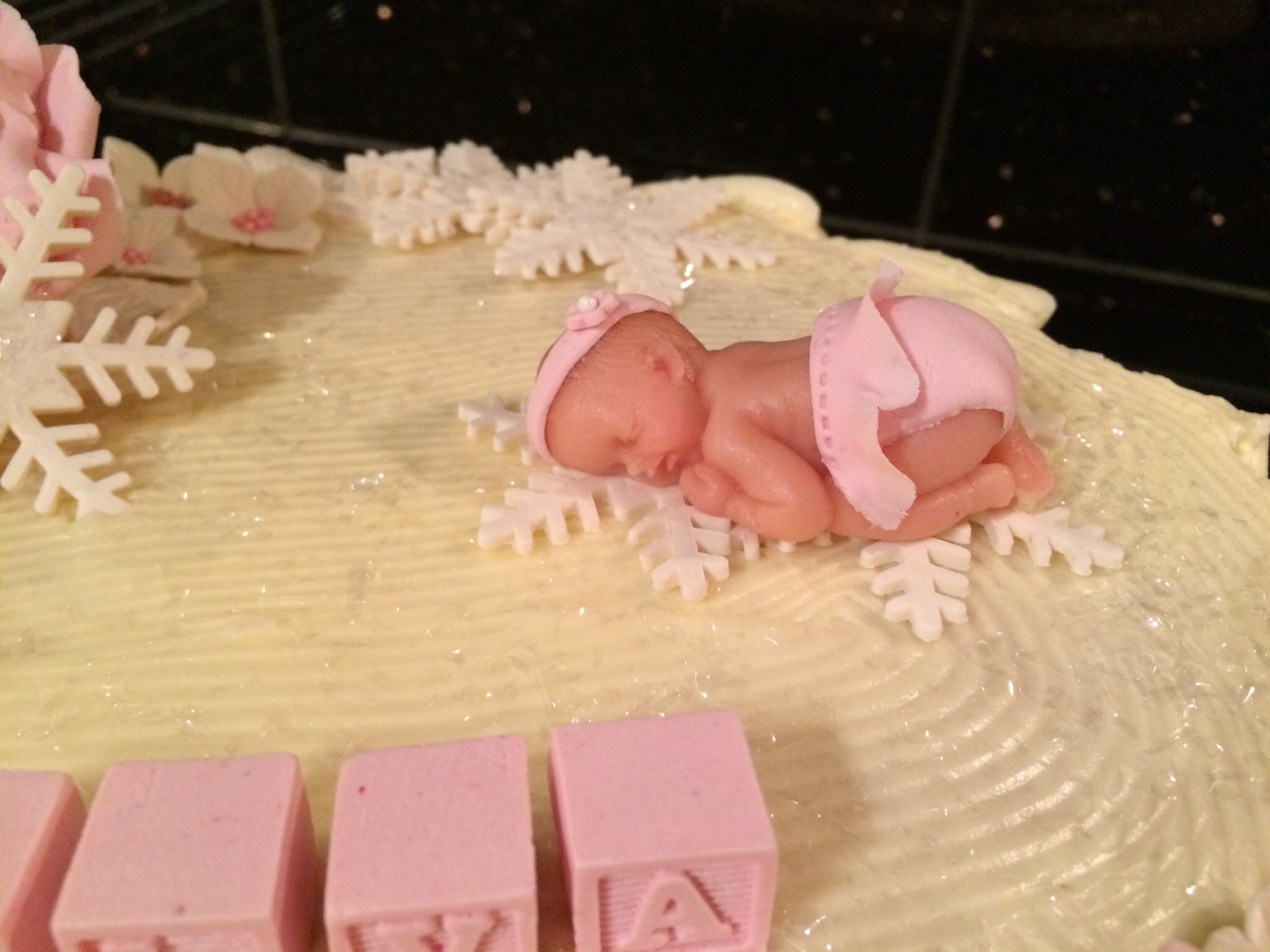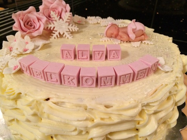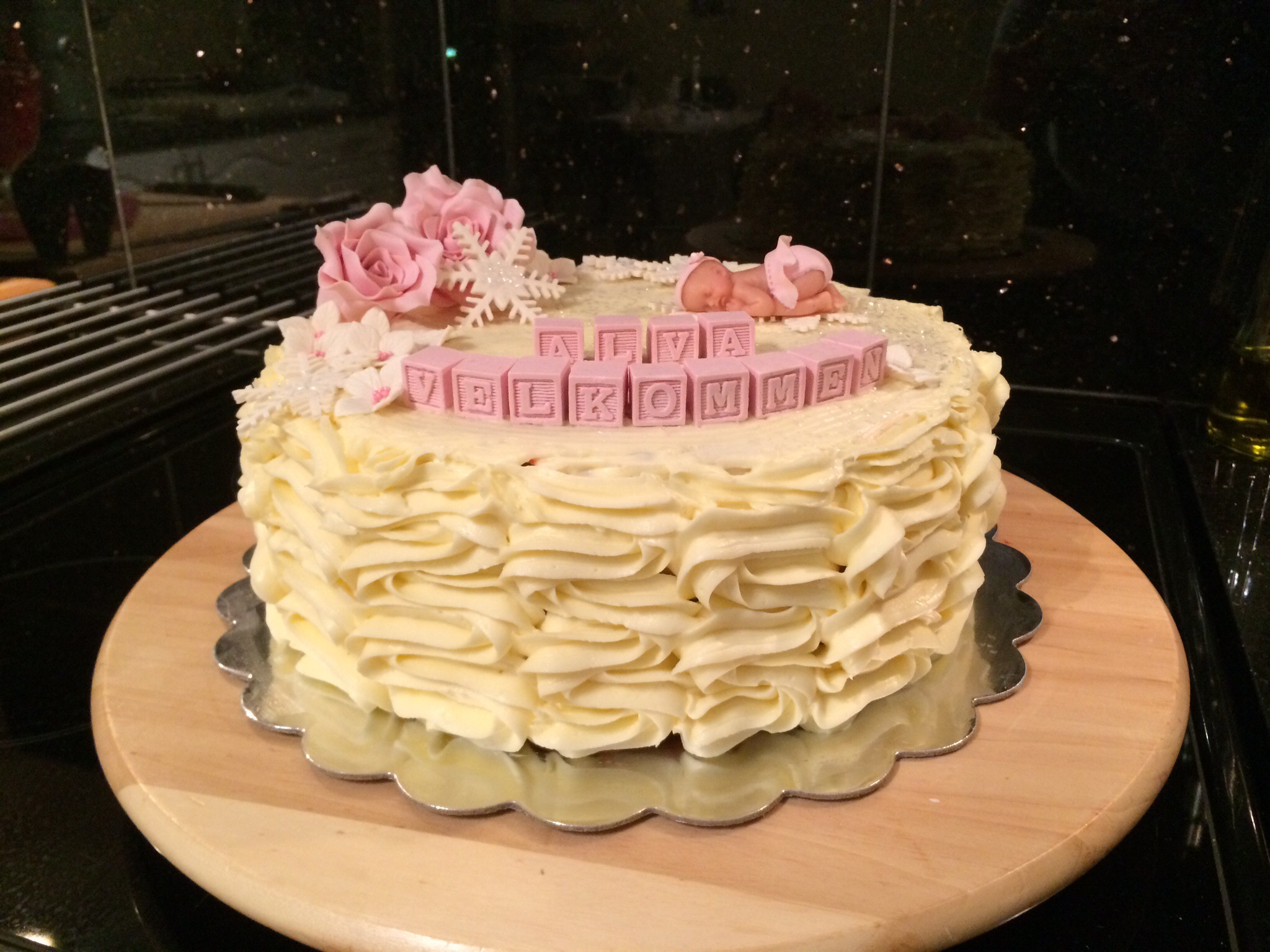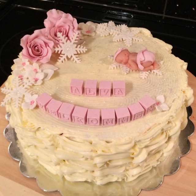 Du er kanskje ikke superimponert over din treige tante som først publiserer dette innlegget når du har blitt tre måneder, men bedre sent enn aldri 😉 I slutten av desember ble altså lille Alva født, og da jeg skulle kjøre den nybakte familien hjem fra sykehuset tok jeg med en velkomstkake. Kaken ble laget i en fei den formiddagen hun ble født siden de ville hjem samme dag, så noen enkle løsninger ble det!