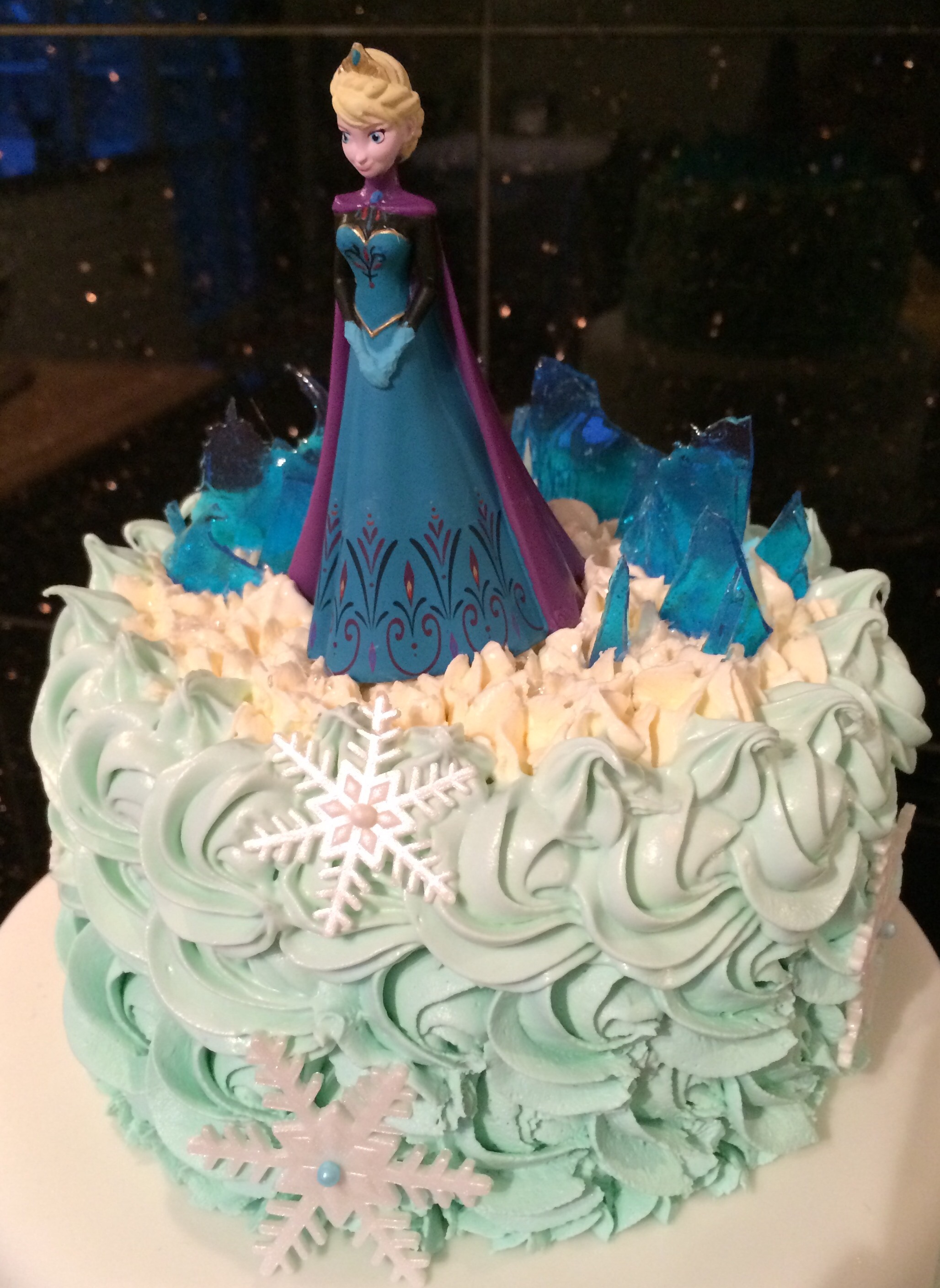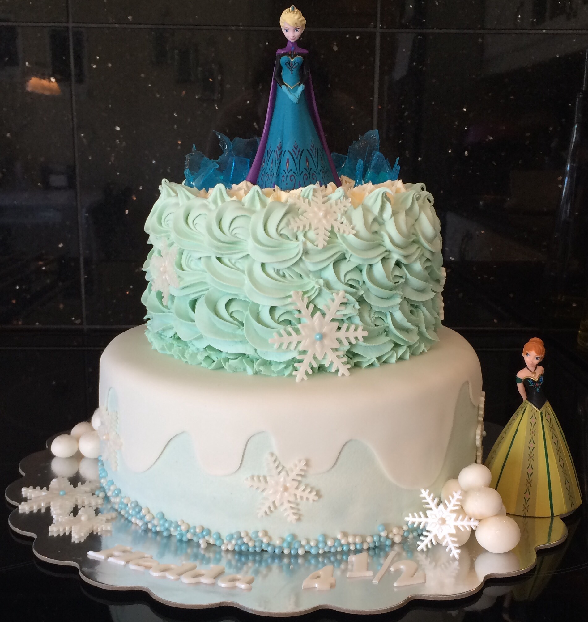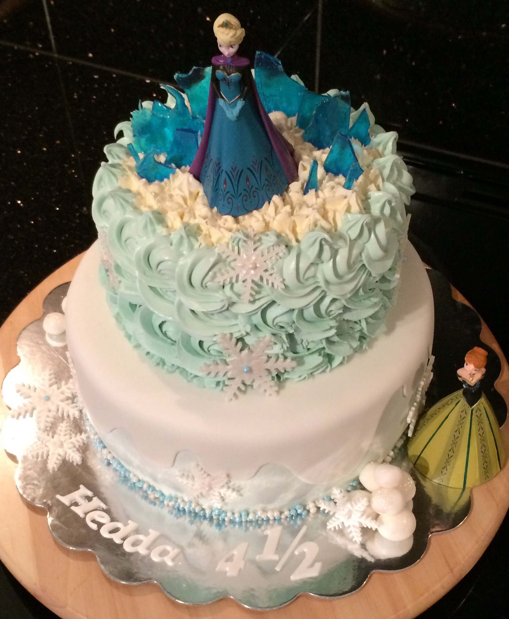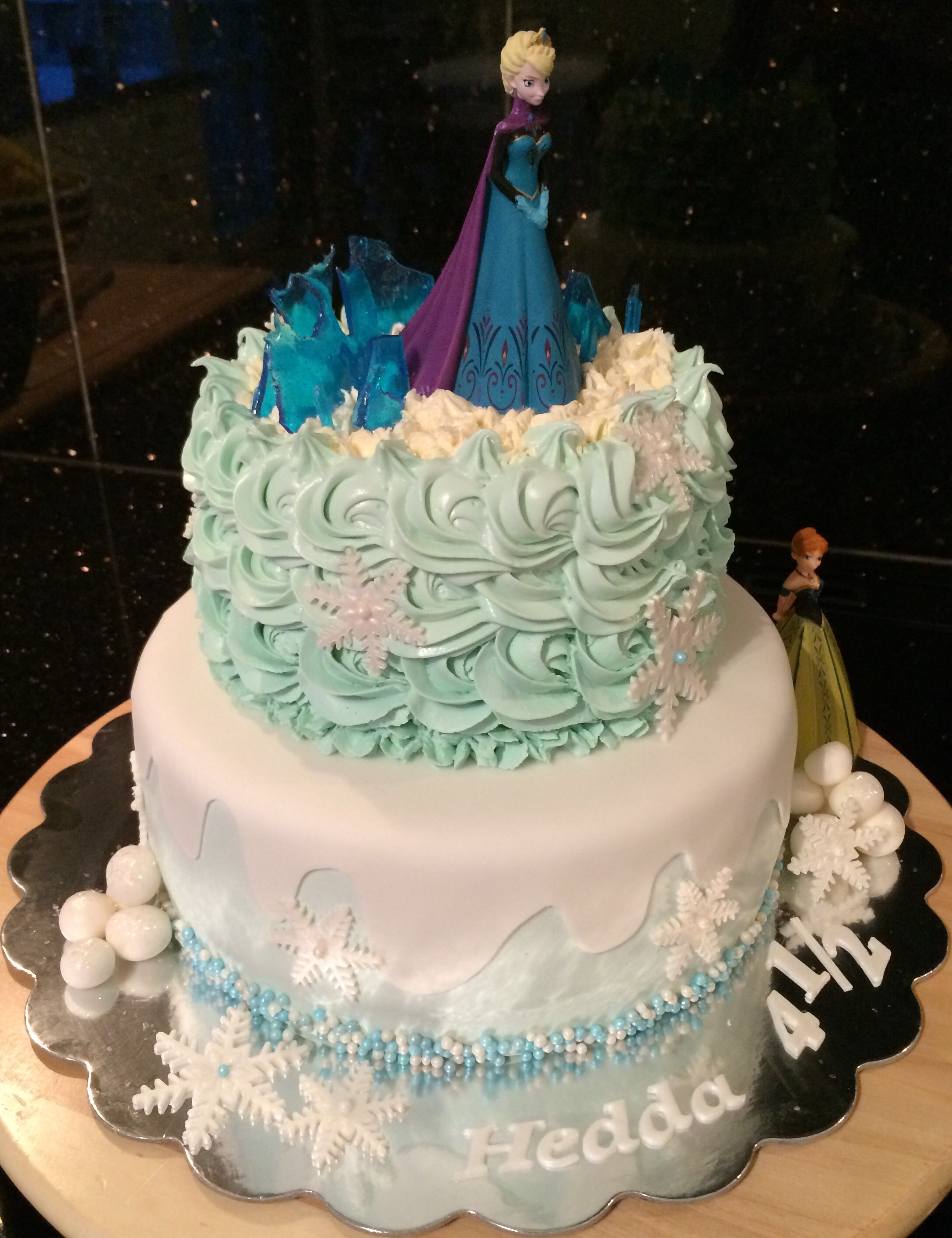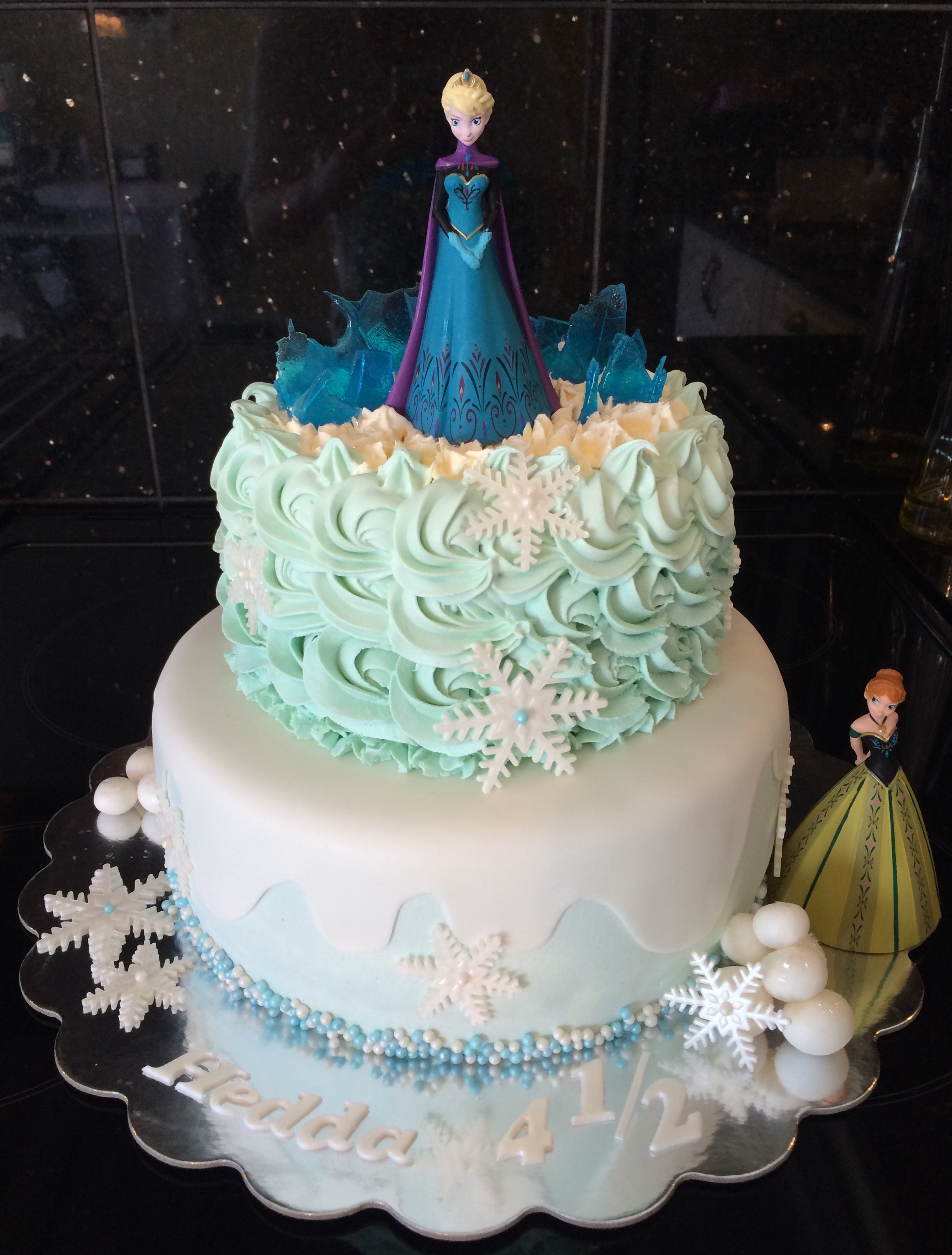 Designmessig gikk jeg (naturlig nok) for blått og hvitt, nederste etasje med et snøteppe over det blå trekket, øverste med lyseblå roseswirls og spiselig glitter. Ellers har jeg dekorert med snøkrystaller, spiselig glass/is av isomalt, perler og snøballer, samt Anna og Elsa-figurer. Disse er ikke spiselige, og er leker Hedda skal få når kaken er spist 😉 Bare sånn at ingen tror jeg er SÅ god, hehe!
