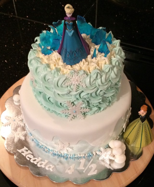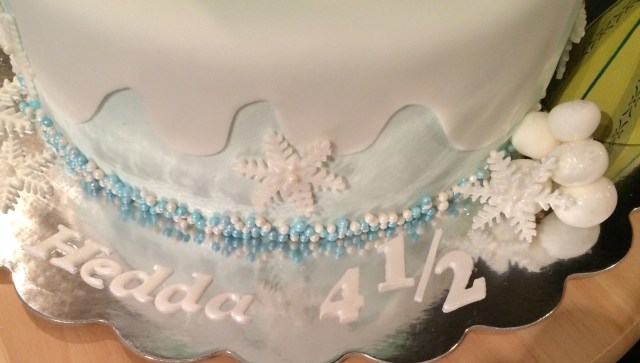 Okey, innser at min eldste datter høres veldig bortskjemt ut, men here goes. Hedda hadde halvtårsdag i dag, og synes at dette var noe vi kunne feire. «Ja hvorfor ikke?» Svarte jeg, og ble dermed satt til å bake for anledningen. Hun har vært litt furt når Frostkake etter Frostkake har forlatt huset, og siden hun elsker Anna og Elsa ville hun ha sin egen kake med Frosttema i dag. Jeg tenkte det var en fin mulighet til å lage en annen type design enn hva jeg har laget tidligere, og mikset litt detaljer fra ulike inspirasjonskilder.