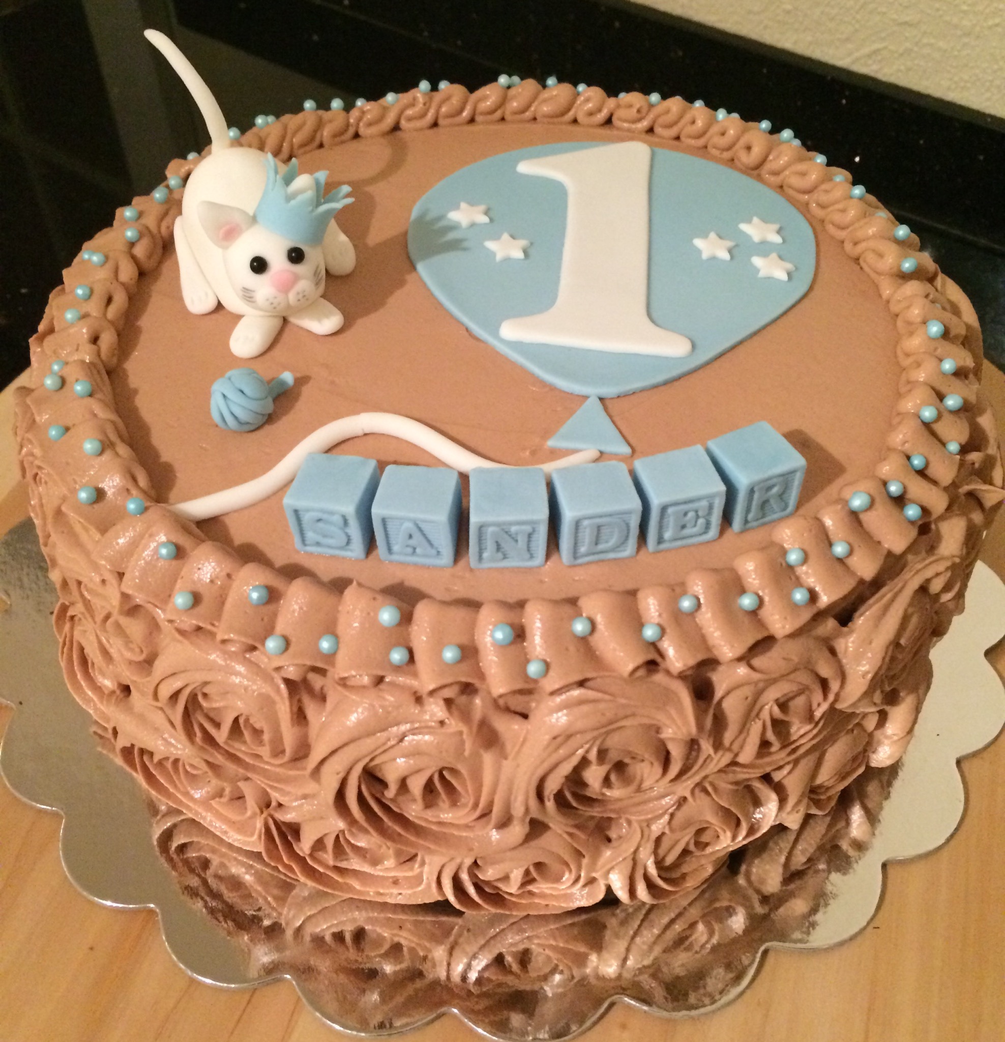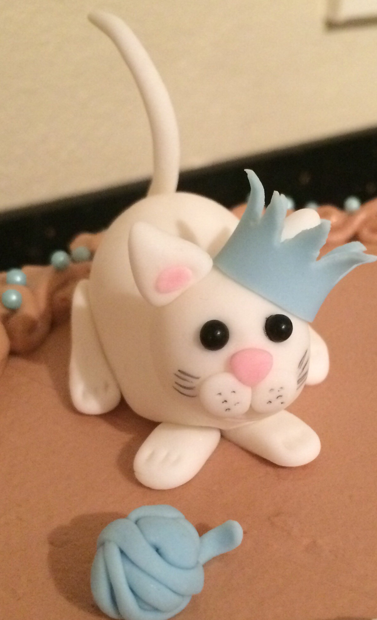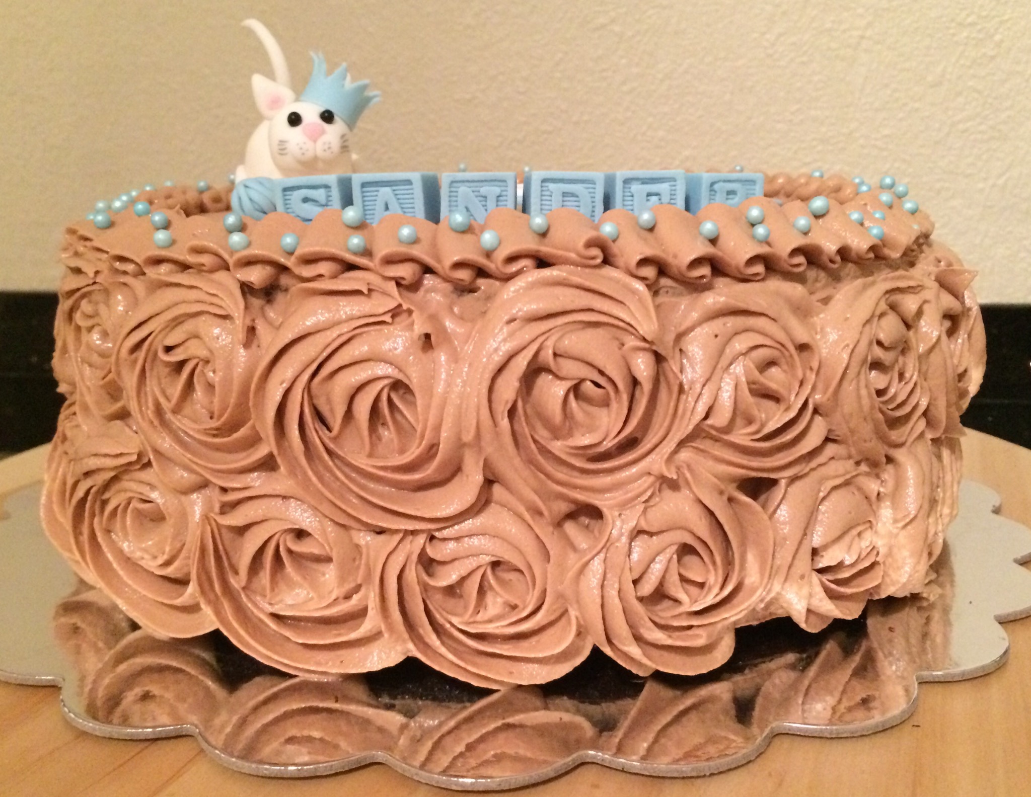 Kaken fikk hun en stor finger med i spillet på. Som datter av en «kakebaker» vet hun utmerket godt hva hun vil ha, og bestilte sjokoladekake med bringebærmousse og melkesjokoladekrem. Pynten måtte være rosa og lilla, og hun ville ha en prinsessekrone på. Her kan dere se resultatet: