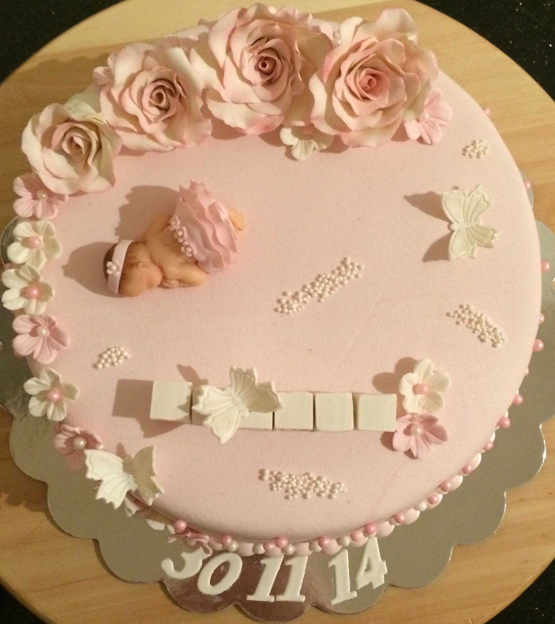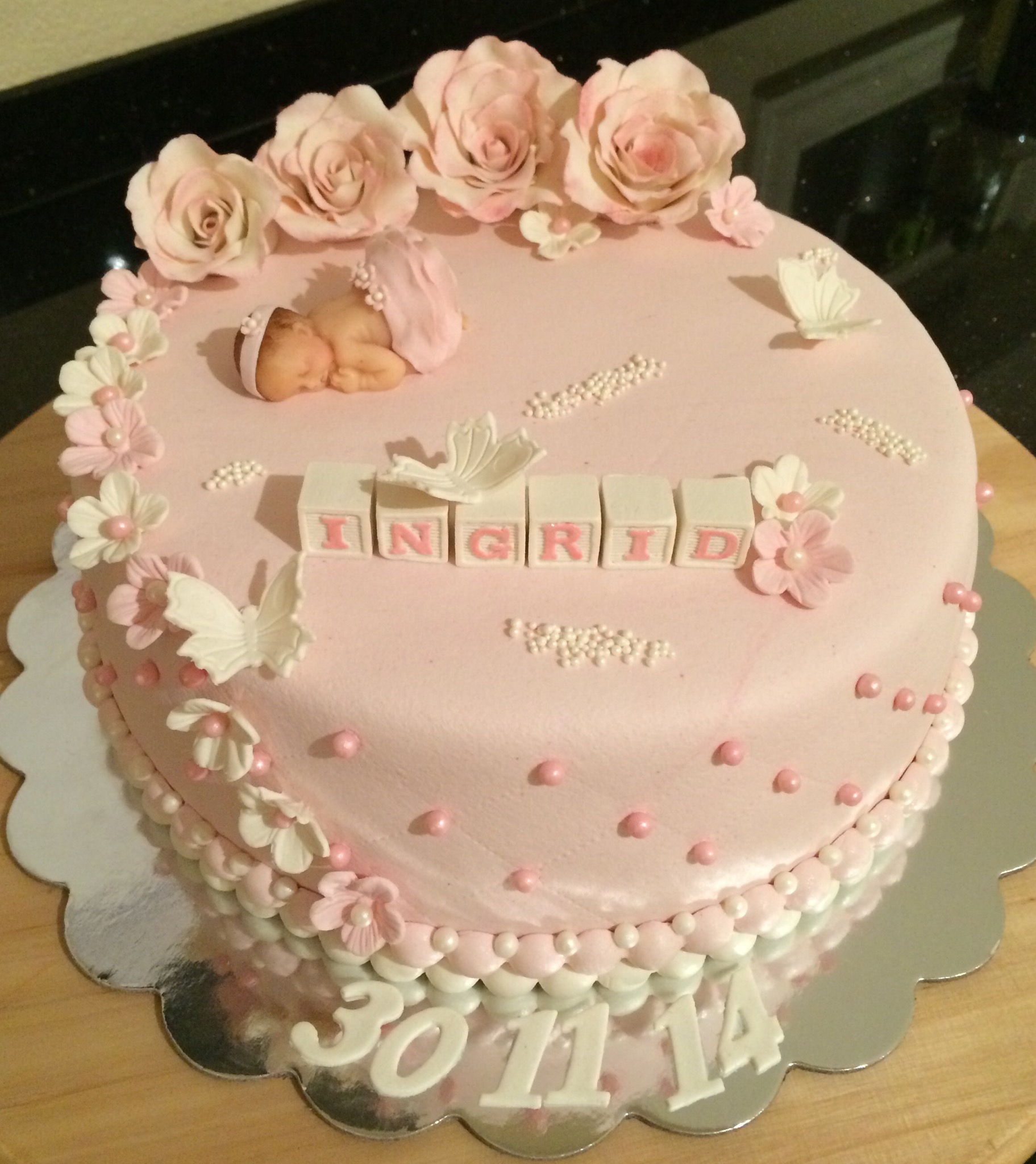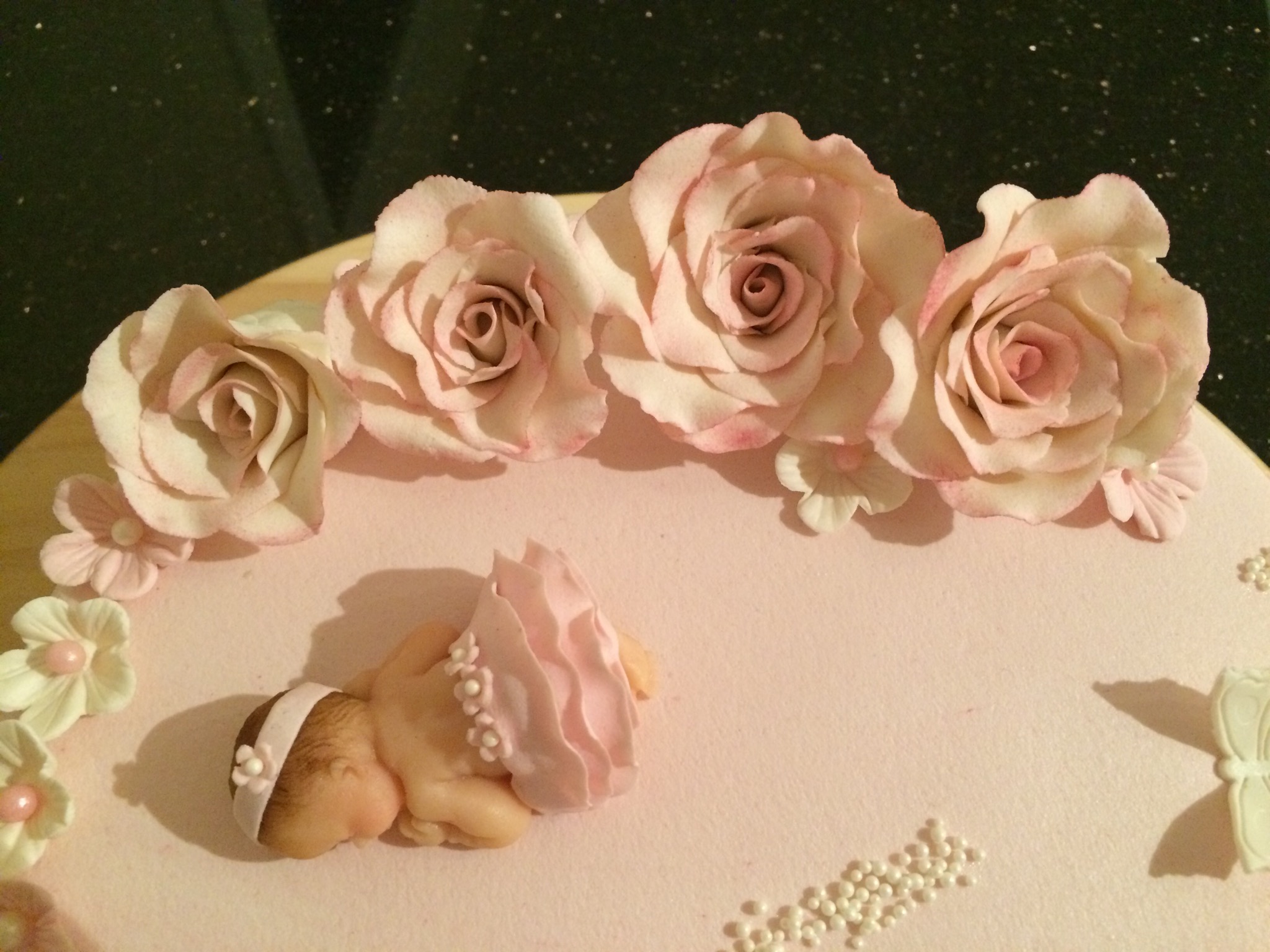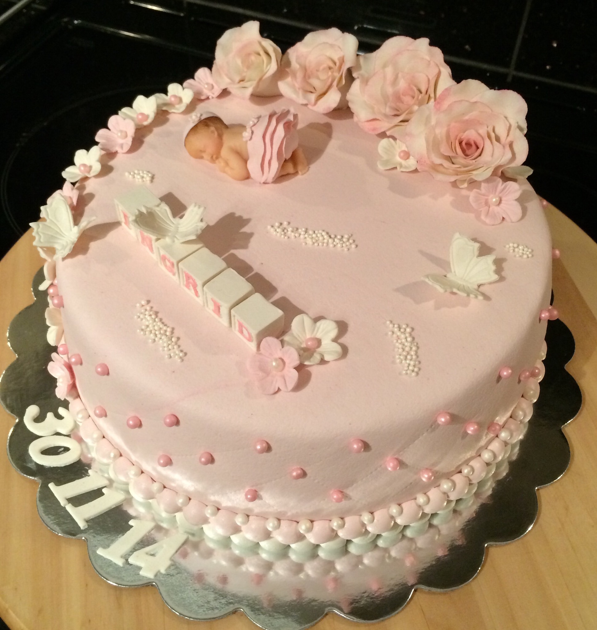 Jeg laget en ganske klassisk utseende dåpskake til Nicolai, med rutemønster på siden, liten baby på toppen, blomster og sommerfugler.